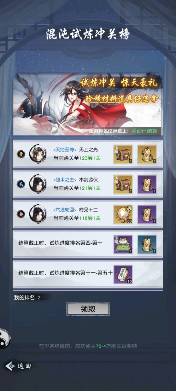 试炼排名刚开就结束了,睡了一觉起来啥奖励都没有了,就给了10张仙术卷,作为供奉的人来说,我缺你10张卷吗?把排名奖励给我换回来啊!