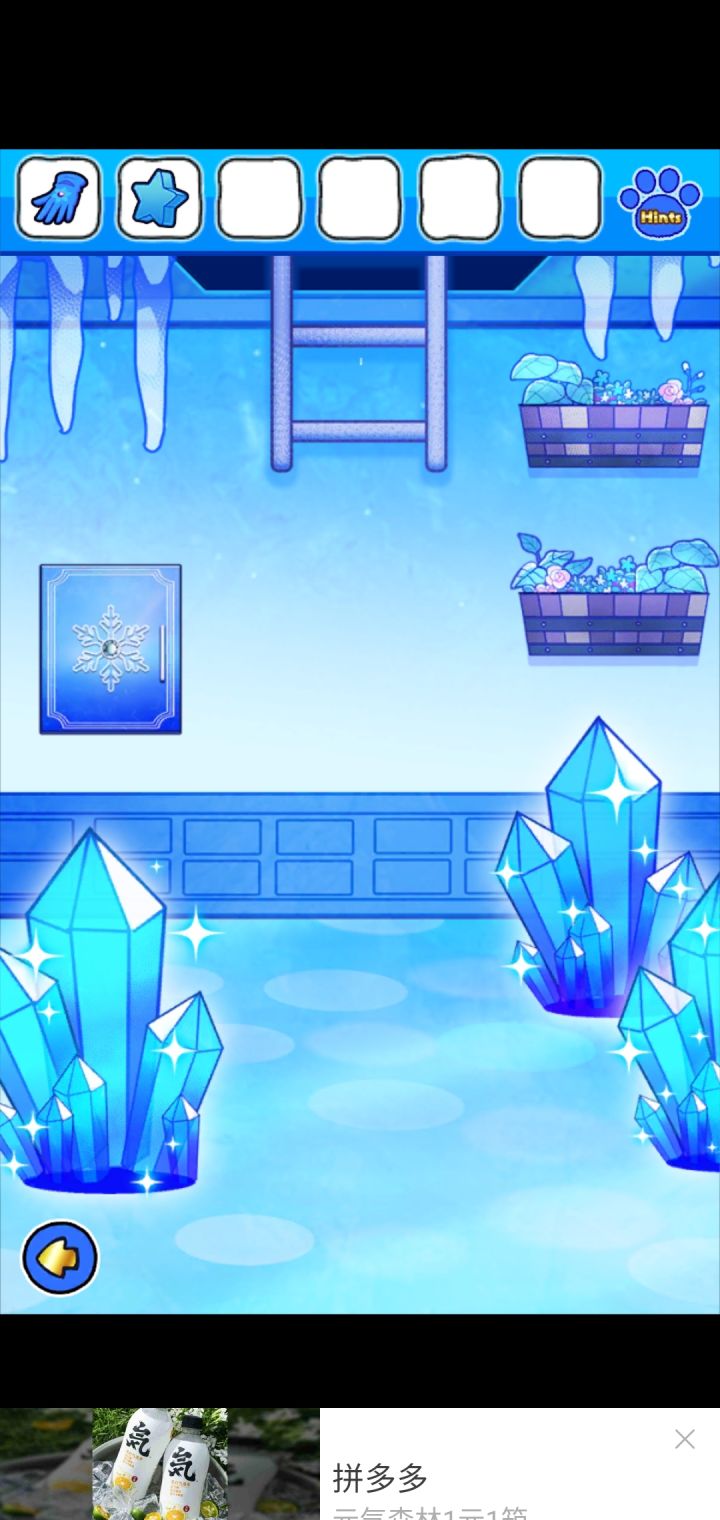 1.(镜子)点击右侧的玻璃柜,获得【黄金的框】和【软木塞】(注意雪人身上的方块样式)2.(大门)点击墙上的开关,按下红色按钮,再放入【黄金的框】,获得【结晶碎片】3.(猫咪冰雕)点击获取圣诞树上的【圣诞树的装饰】4.点击墙上的画,在左下角获得线索(56)5.点击猫咪冰雕底座,放入【结晶碎片】6.根据雪人身上的线索,按下对应位置的方块;打开底座,获得【把手】7.(镜子)点击镜子底座,把【