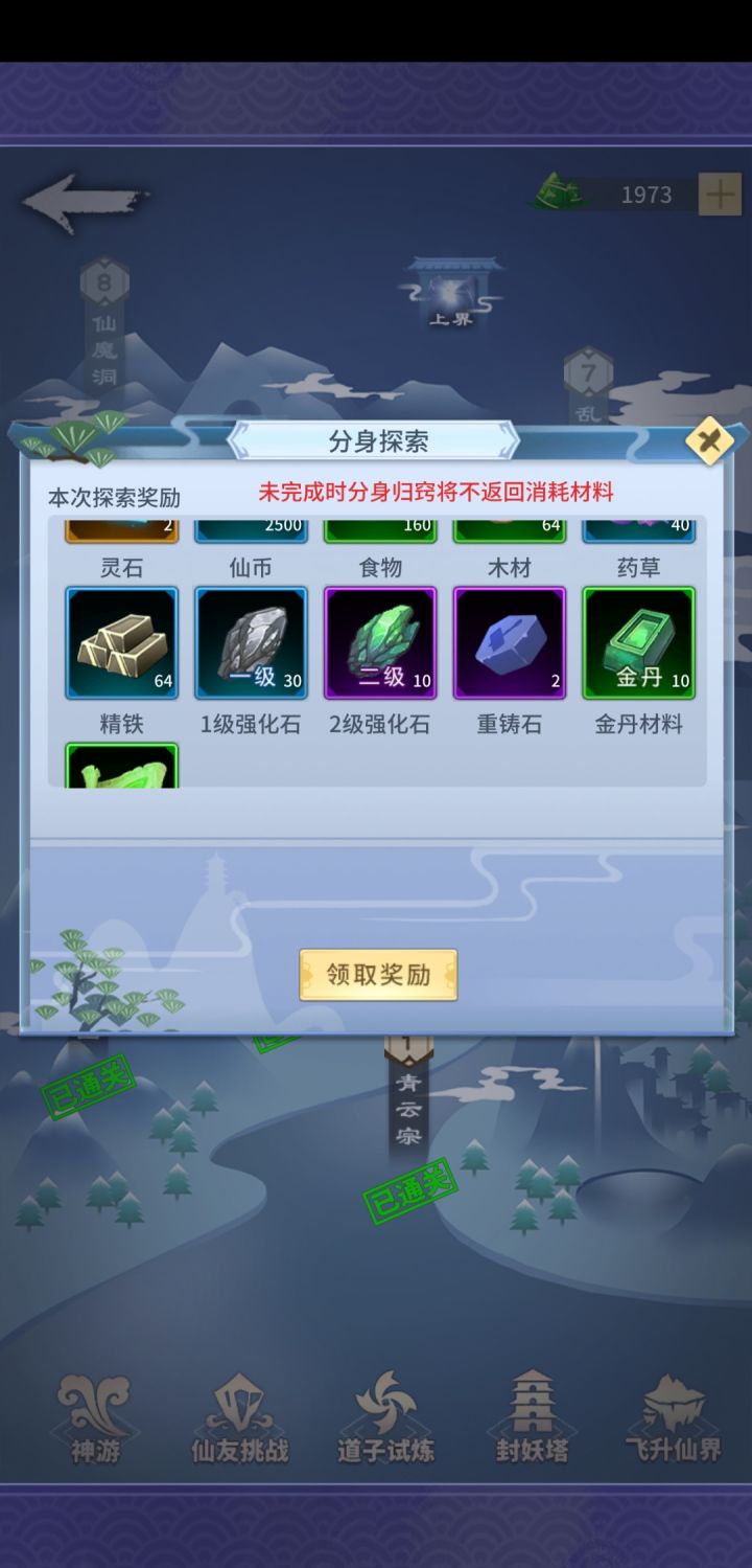 刚解锁分身探索,各个地图加起来十三次一本书都没有,不知道是设定是这样还是bug了,但是感觉如果自动刷图没有书,我还是要选择手动刷图,属性更重要吧另外还有小bug,吃二级修炼丹有时候不加修为,灵玉床有时候也不加。游戏模式还是很好的,加了很多新东西,期待接下来的更新。ps:网络优化太重要了!