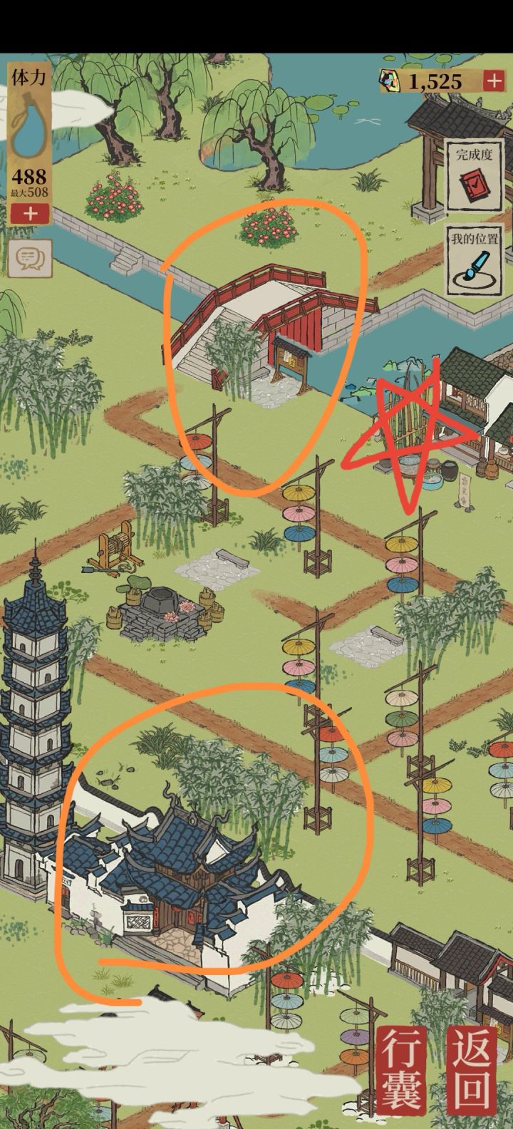 XDM!钱塘春行的砖和草龟,图一中圈圈定位找位置,桥旁边渔具店获得鱼竿,一次五杆鱼竿。图二中,上边池塘找草龟,下方是砖。尽量用探险值高的,砖那里有个小挑战,一次五块砖。