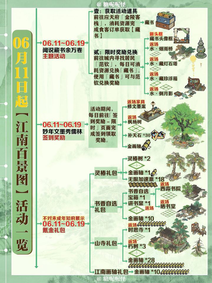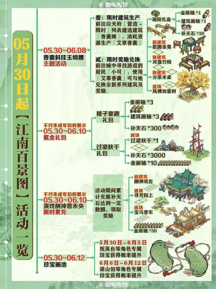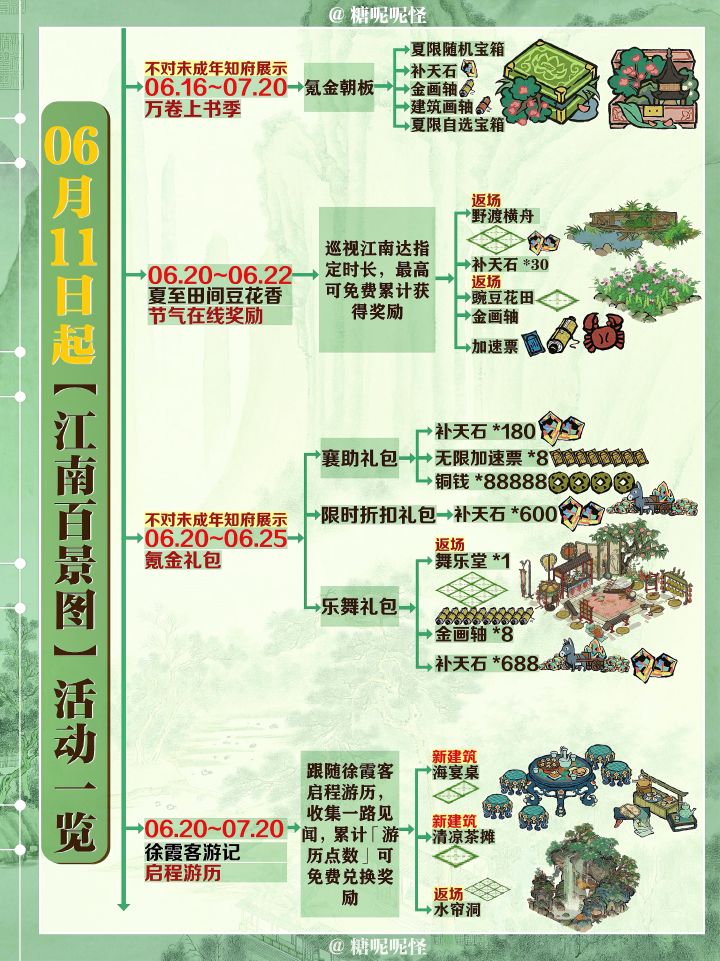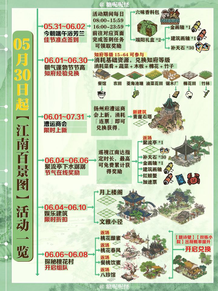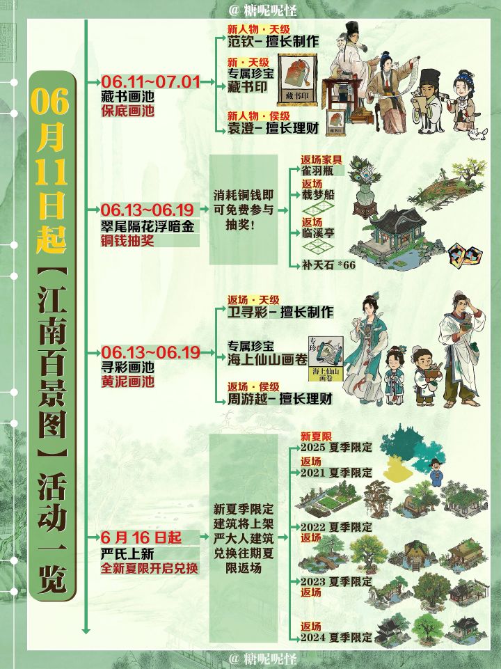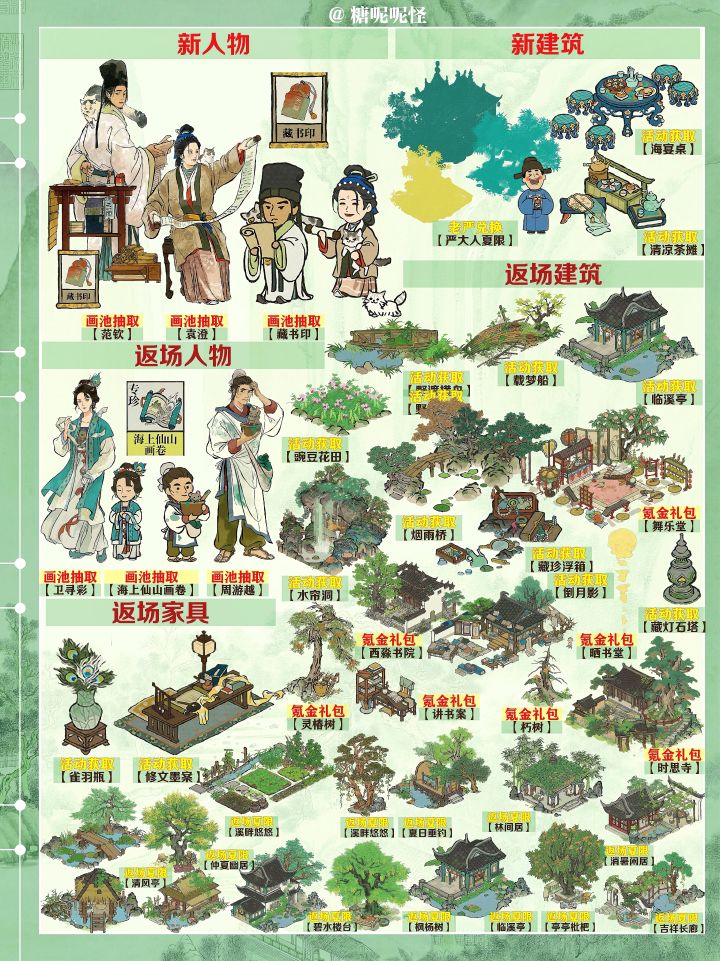 1️⃣新居民:范钦|袁澄2️⃣新建筑:海宴桌|清凉茶摊|老严夏季三件套3️⃣返场人物:卫寻彩|周游越4️⃣返场建筑:西淼书院|晒书堂|时思寺|烟雨桥|舞乐堂#江南百景图 #游戏种草计划 #今天游戏圈发生了啥