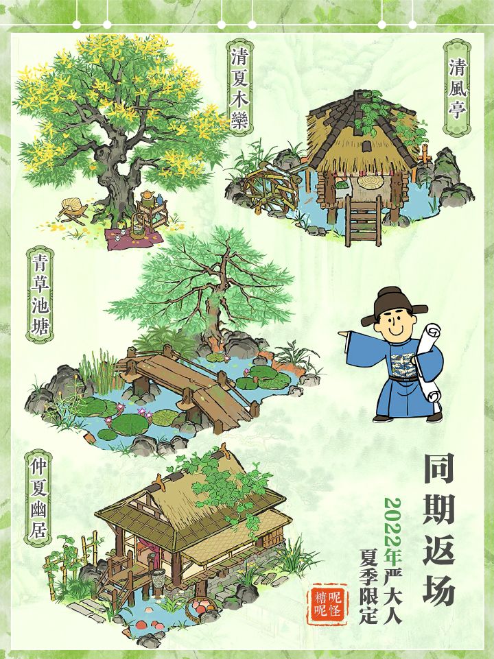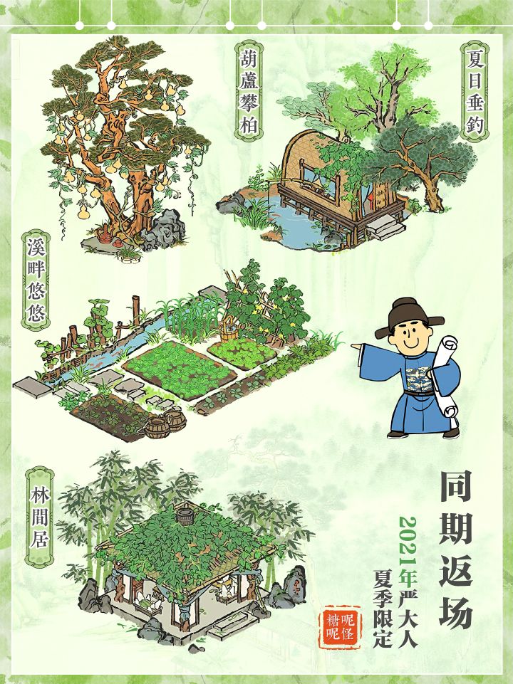 1️⃣2025年全新夏季限定建筑:【溪畔角亭】【石桥花荫】【竹桃残碑】2️⃣2024年夏季限定同期返场:【碧水楼台】【临溪亭】【枫杨树】3️⃣ 2023年夏季限定同期返场:【亭亭枇杷】【吉祥长廊】【消暑闲居】4️⃣ 2022年夏季限定同期返场:【清夏木栾】【青草池塘】【仲夏幽居】【清风亭】5️⃣ 2021年夏季限定同期返场:【葫芦攀柏】【溪畔悠悠】【夏日垂钓】【林间居】#江南百景图 #游