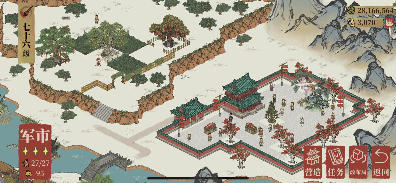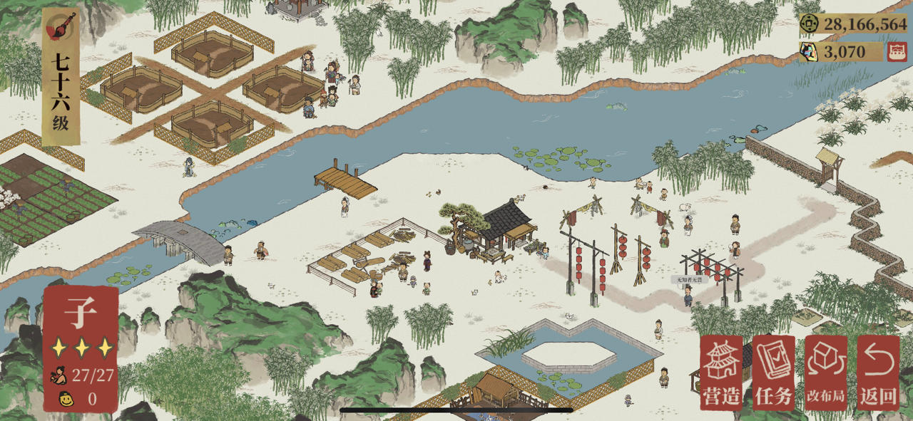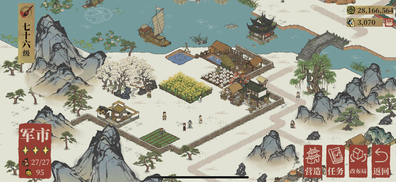 鸡鸣山 星宿 井宿·下 陆:弧矢 资源消耗1.①建造手工坊 250饭 240盐 2小时 ②买木料 30饭 95鞋子 30分2.①制作首饰盒 250饭 250竹子 2小时②浸泡桃花枝 220饭 280盐 1小时12分3.①建造澡堂 120饭 90标布 2小时 ②沐浴更衣 70饭 65鞋子 3小时③整理衣着 50饭 70刺绣 1小时12分4.①改造木桥 300饭 250盐 3小时②建