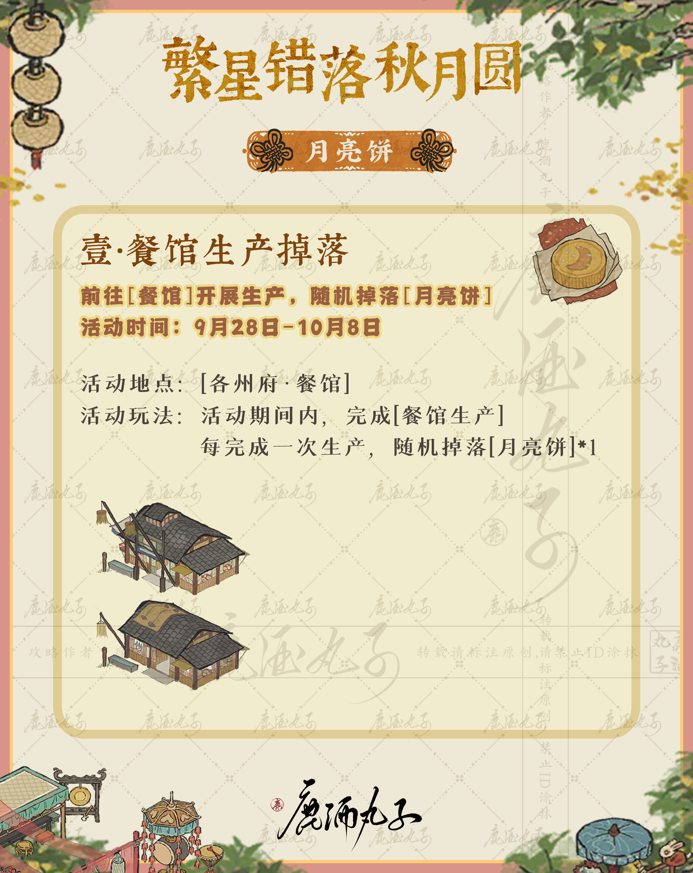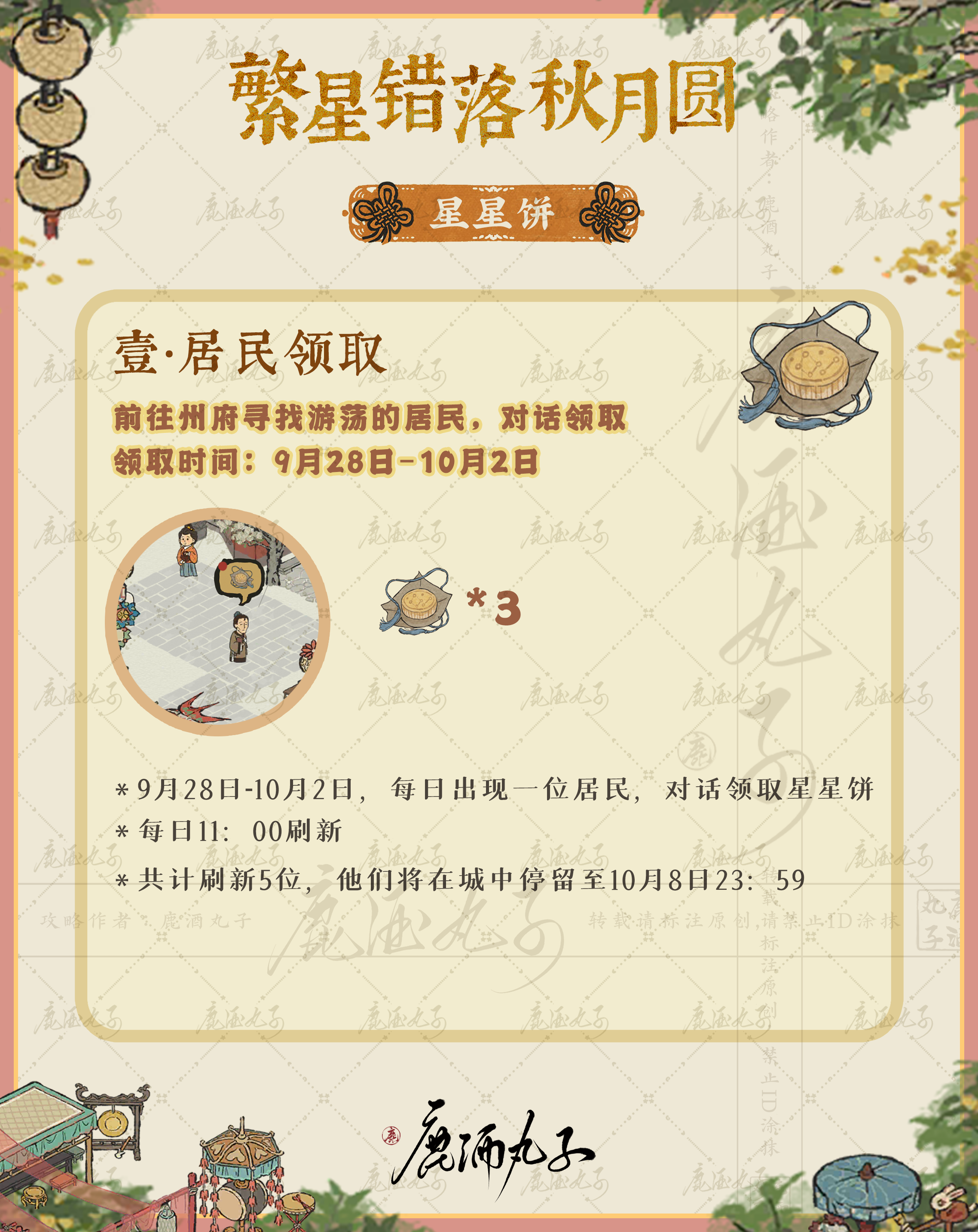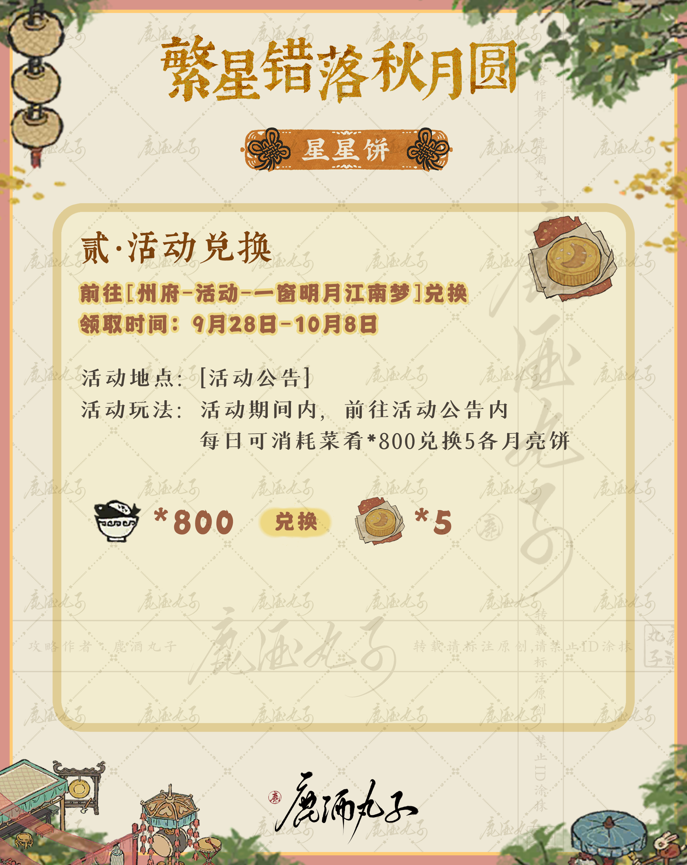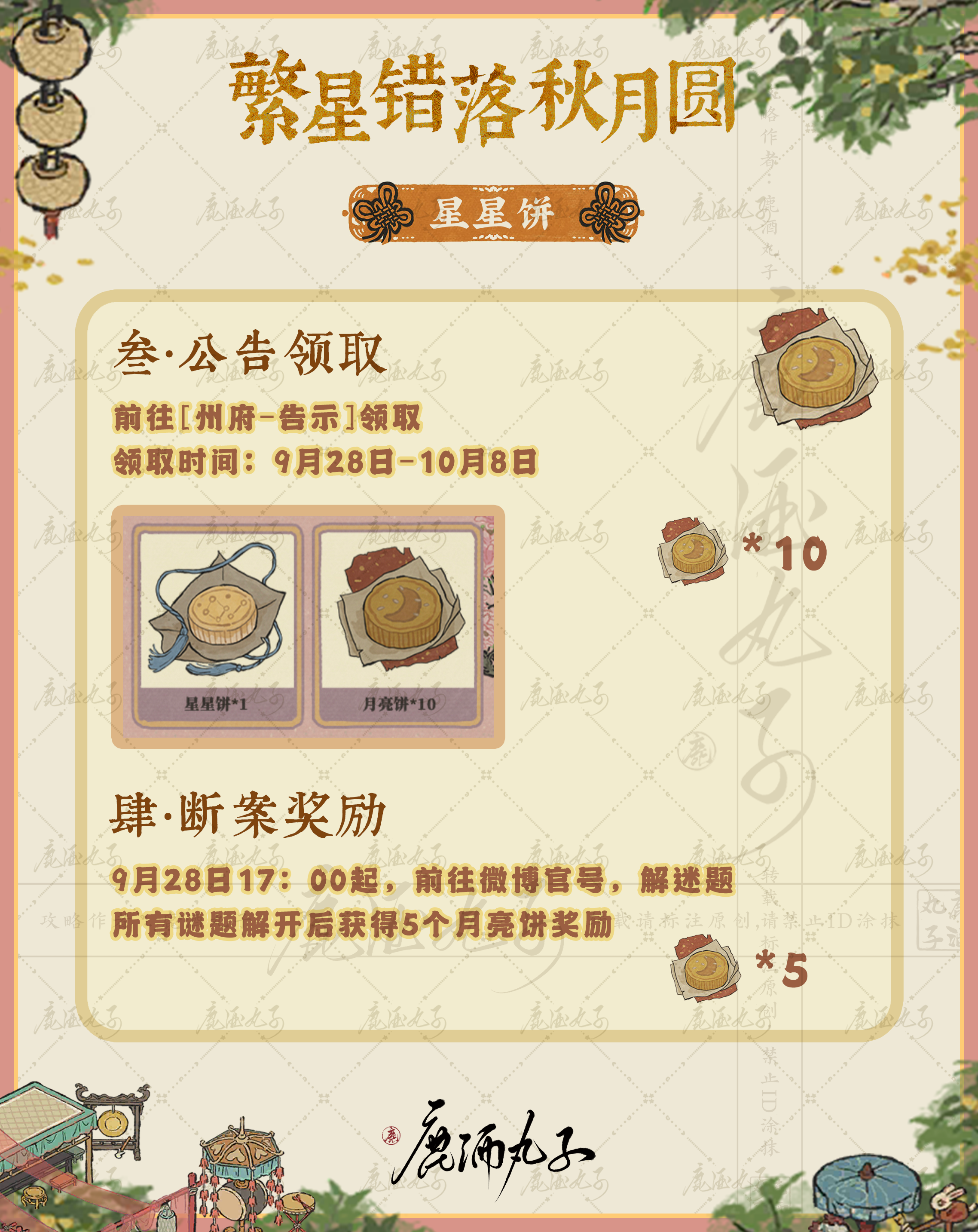 🌿图1-时间线🌸在活动时间内收集材料,可进行兑换好礼和抽奖🌸活动时间:9月28日11:00-10月8日23:59(GMT+8)🌿图2、3-星星饼🌸壹·居民领取🌸贰·公告领取🌿图4~6-月亮饼🌸壹·餐馆生产掉落🌸贰·活动兑换🌸叁·公告领取🌸肆·断案奖励🌿图7-婵娟奖券🌸十月月签奖励🌸领取时间:10月4日起🌿图8-奖励兑换🌿图9-婵娟奖券抽奖#攻略#江南百景图#江南百景图攻略