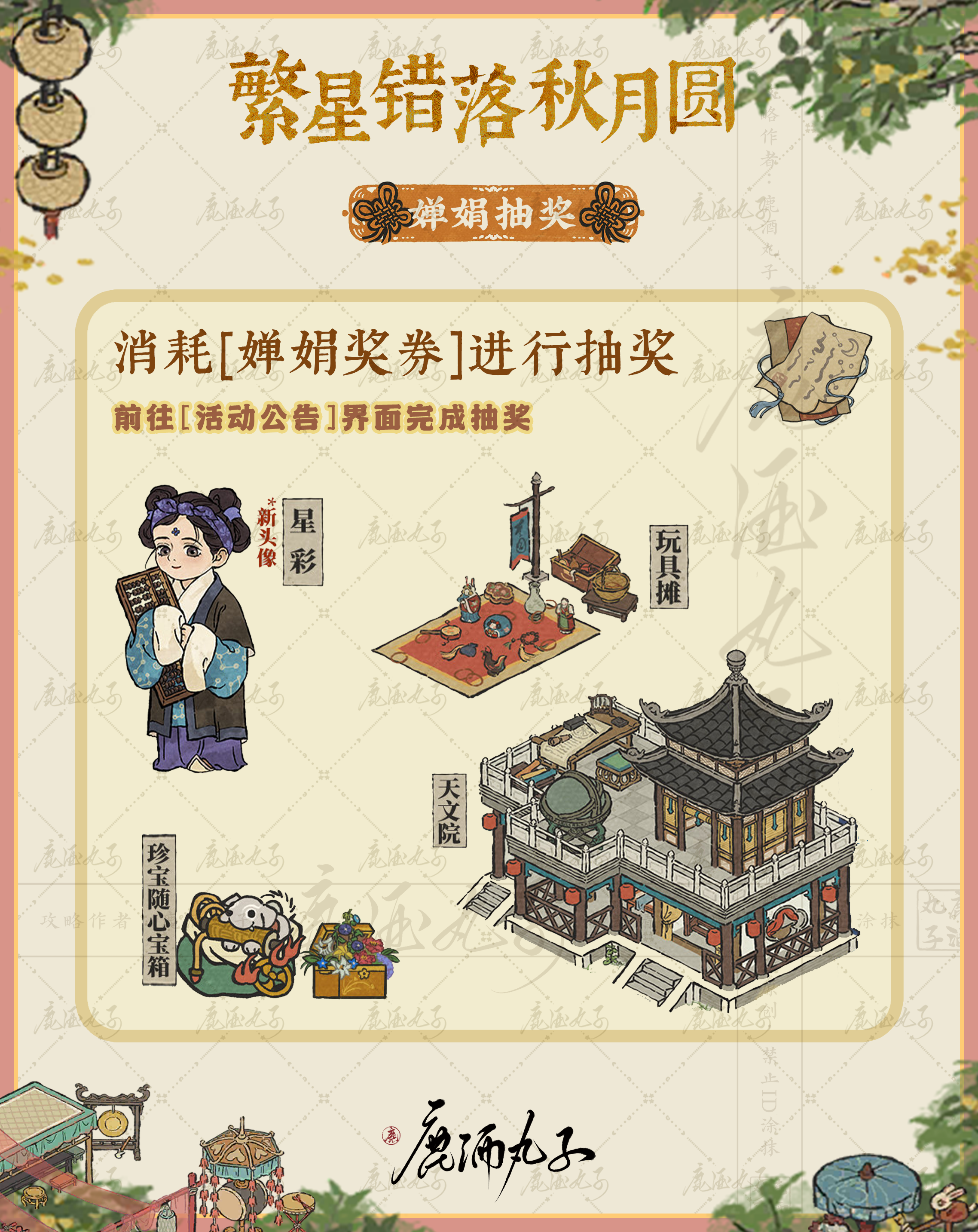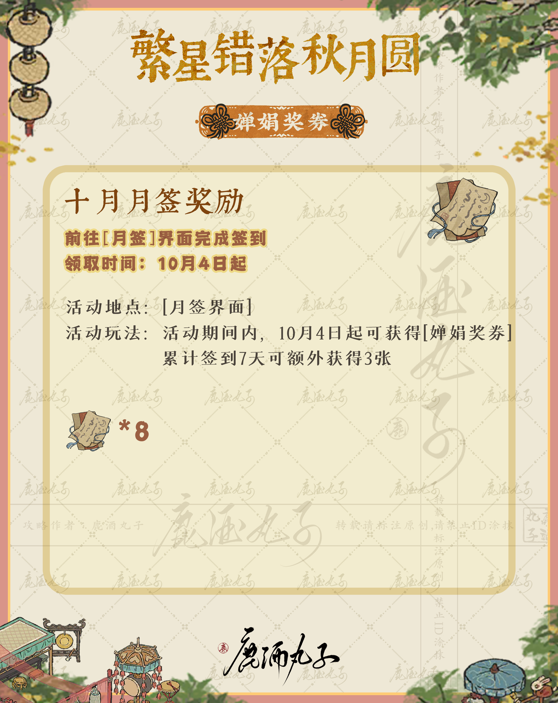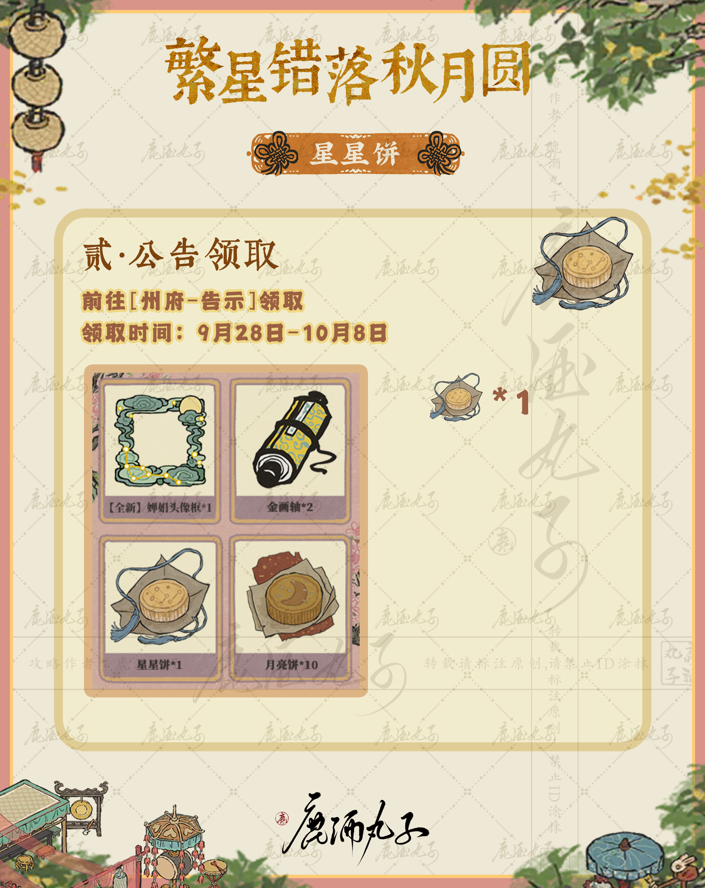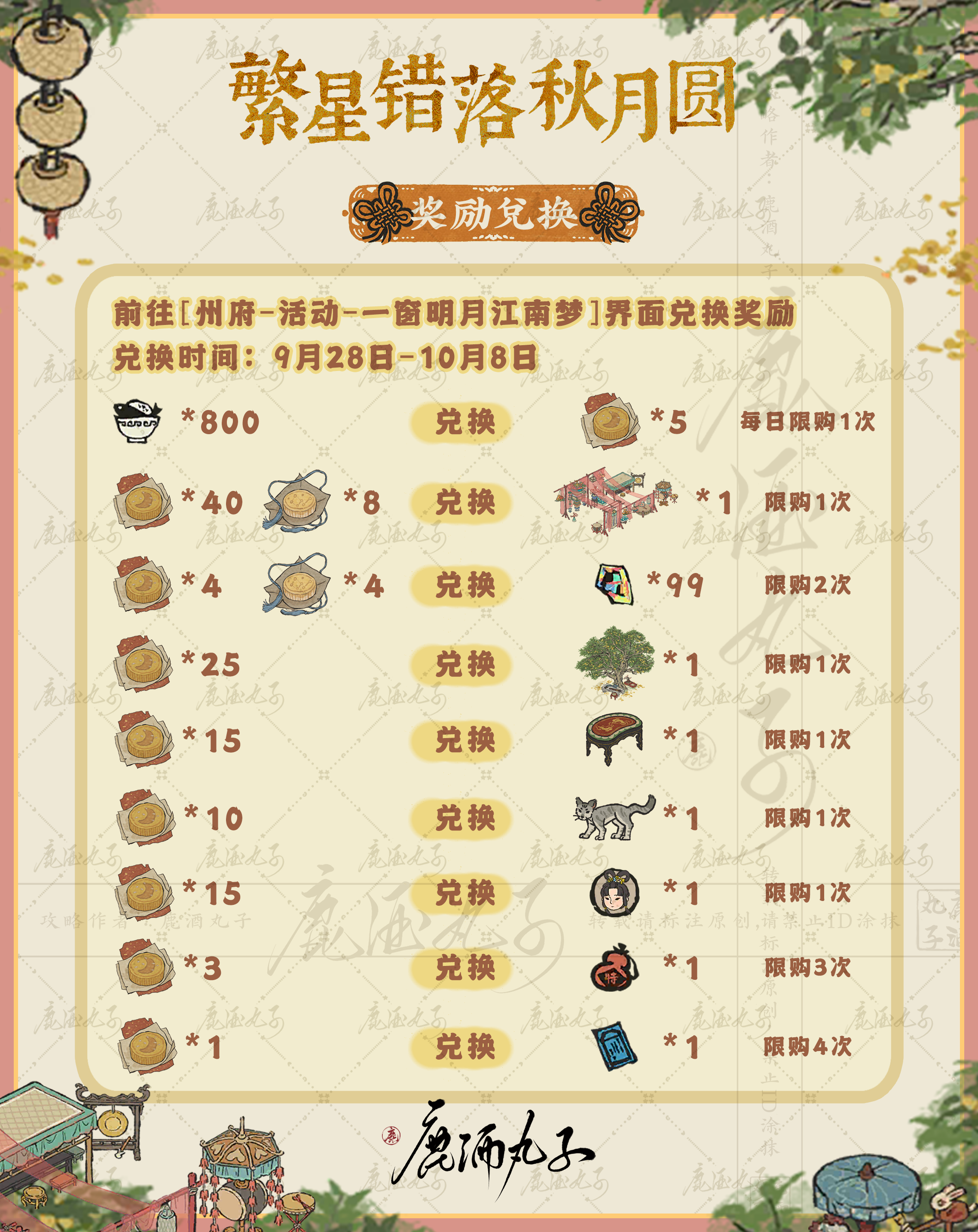 🌿图1-时间线🌸在活动时间内收集材料,可进行兑换好礼和抽奖🌸活动时间:9月28日11:00-10月8日23:59(GMT+8)🌿图2、3-星星饼🌸壹·居民领取🌸贰·公告领取🌿图4~6-月亮饼🌸壹·餐馆生产掉落🌸贰·活动兑换🌸叁·公告领取🌸肆·断案奖励🌿图7-婵娟奖券🌸十月月签奖励🌸领取时间:10月4日起🌿图8-奖励兑换🌿图9-婵娟奖券抽奖#攻略#江南百景图#江南百景图攻略