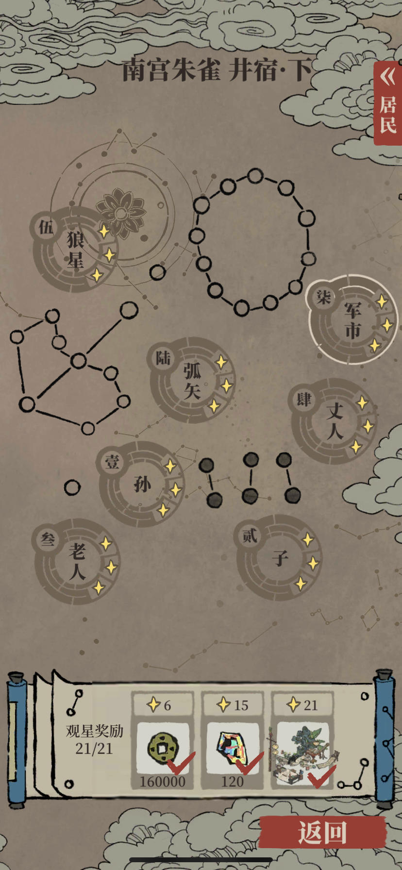 星宿玩法井宿·下 关卡解读🌿井宿·井木犴🌸南方七宿第一宿,位于双子座,共设星官二十位,其中主星官“井”包含八颗星。🌸井宿属水,为犴(即驼鹿)。为南方第一宿,其组合星群状如网,由此而得名“井”(井字如网状)。井宿就象一张迎头之网,又如一片无底汪洋,故井宿多凶。🌸“南宫朱鸟权衡,东井为水事。”——《史记天官书》🌿井宿关卡所需物资:[以下物资统计为@鹿酒丸子 通关所用,每种任务选择了最省钱