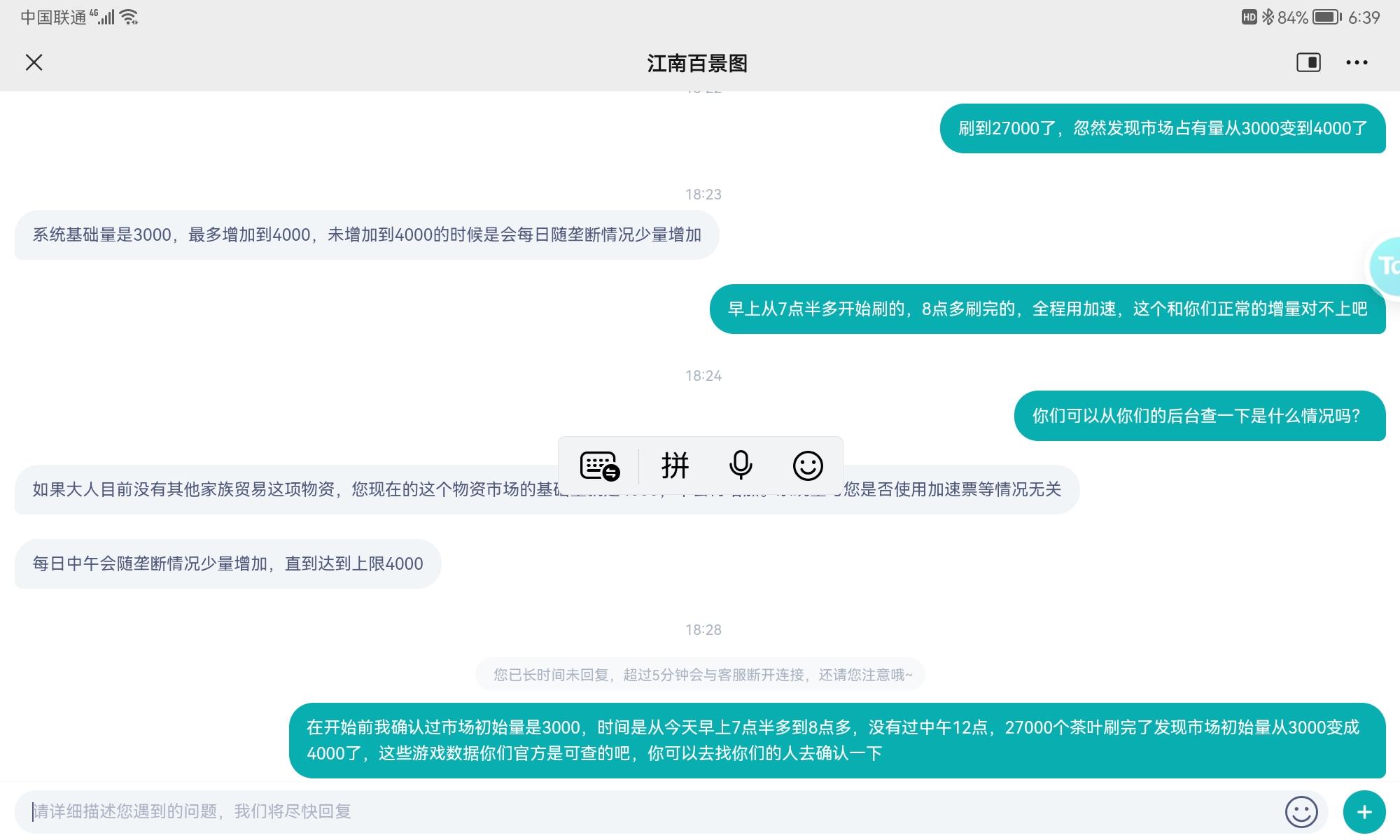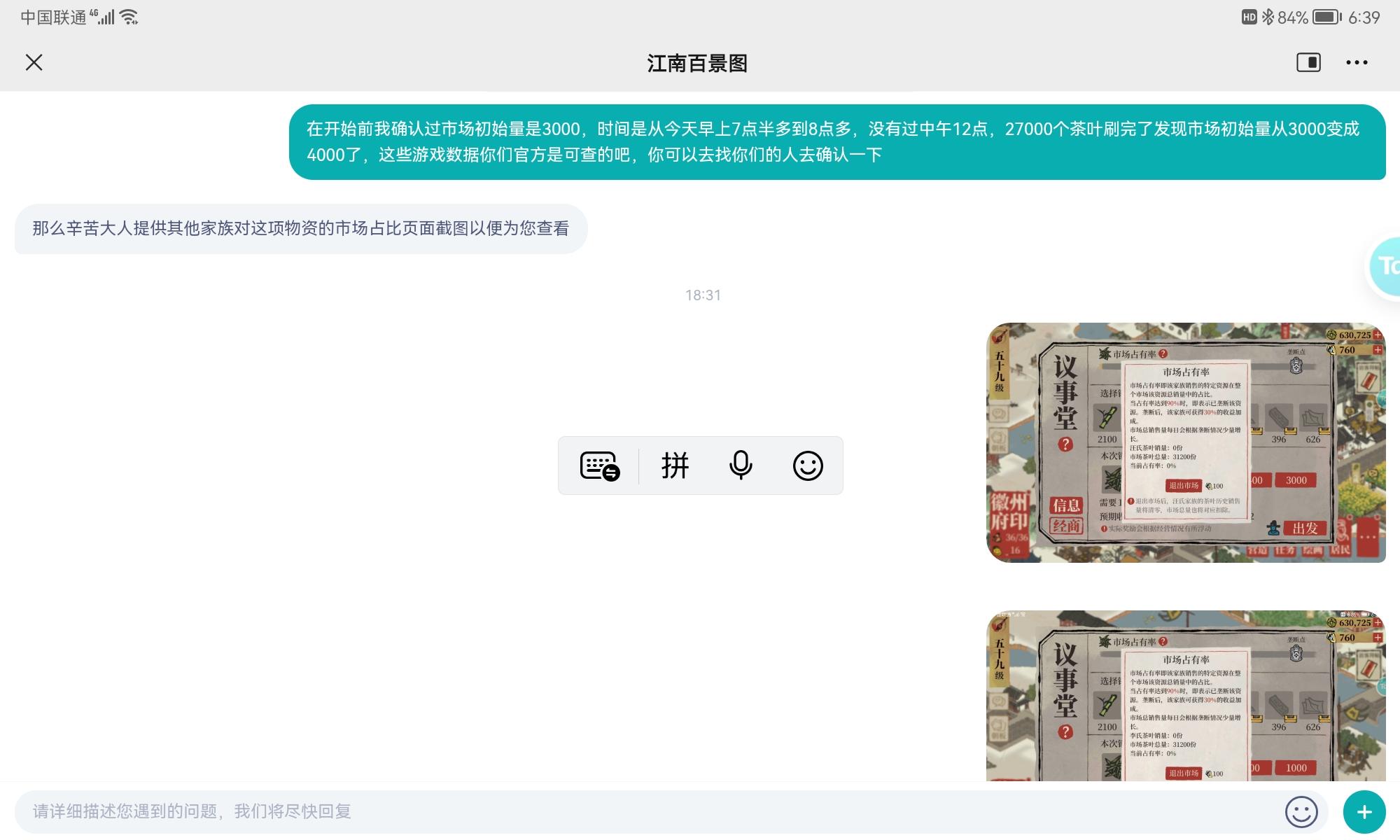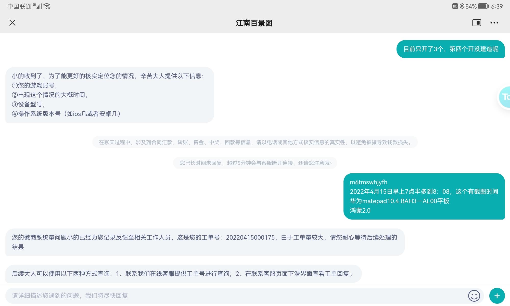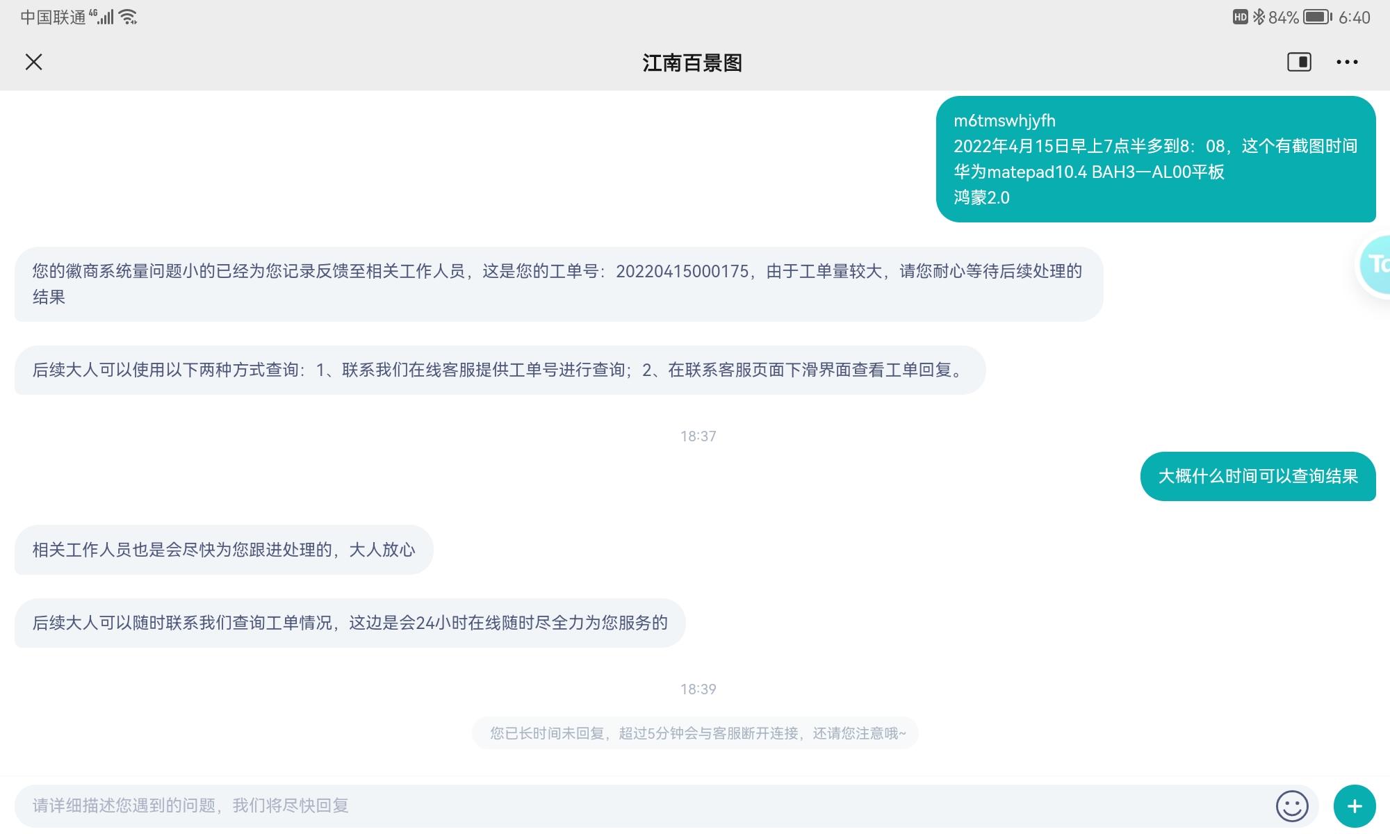 江南的客服处理速度真是见识到了,4月15日就提交了,4天过去了,一点反应也没有,问就说在查,每天连个进度都没有。今天发个帖子记录一下,大家都看看江南的处理速度到底怎么样。这个问题是关于一天垄断徽商的,具体的聊天记录不一个个复制了,大家看截图吧。