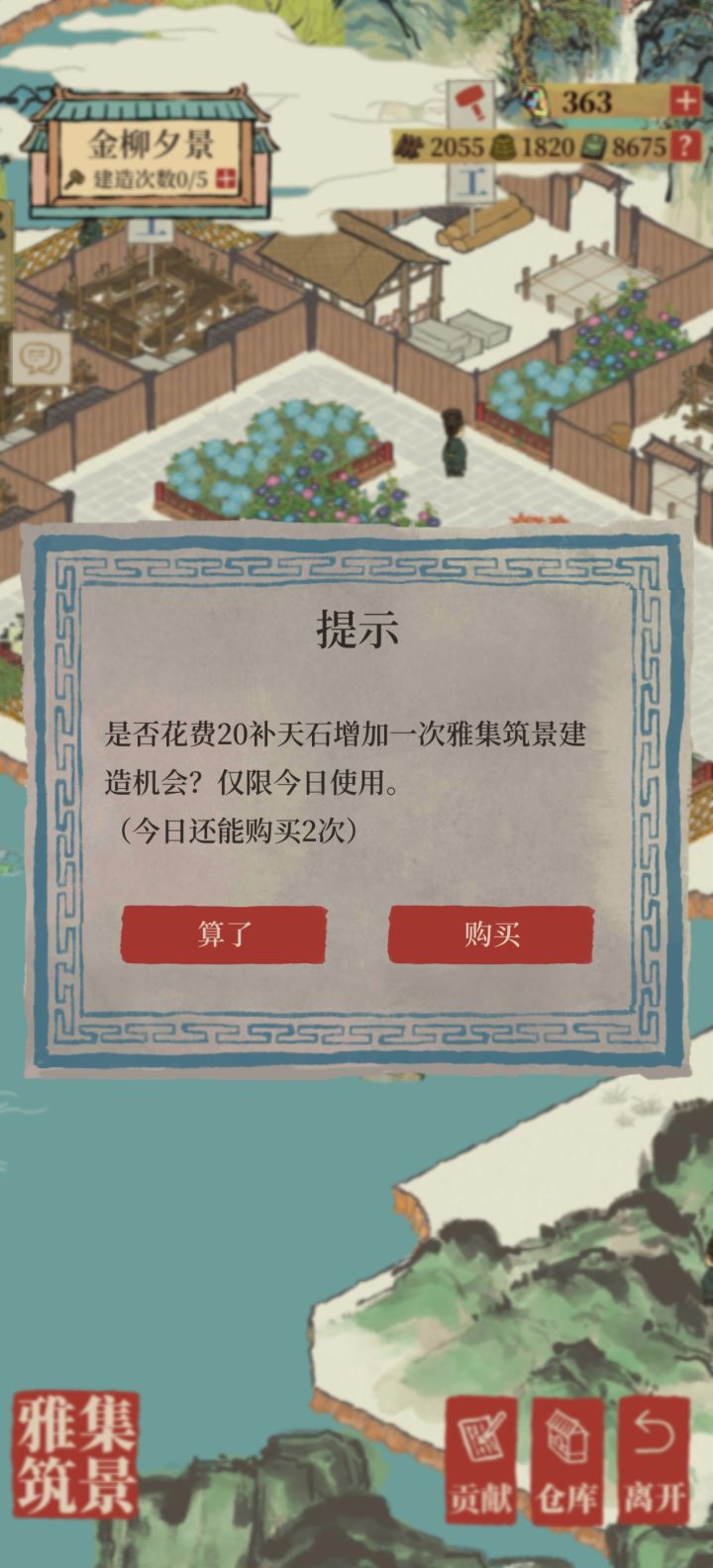 看过贡献日志了,今天之内没有我的游戏名(还是很好查的,今天才刚开始),只有另一个人的名字,下面也都是其他人的名字,但是建造次数空的,点建造小景就会有弹窗