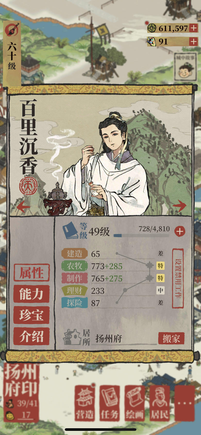 六十级知府,每个城市都有超过五个高探险人物,随便一个就是体力400+/500+,所有城市已经更新的探险地图全部完成了,行囊里的酒用不完每个月等过期,只有桃花村开启的时候才偶尔去探险。