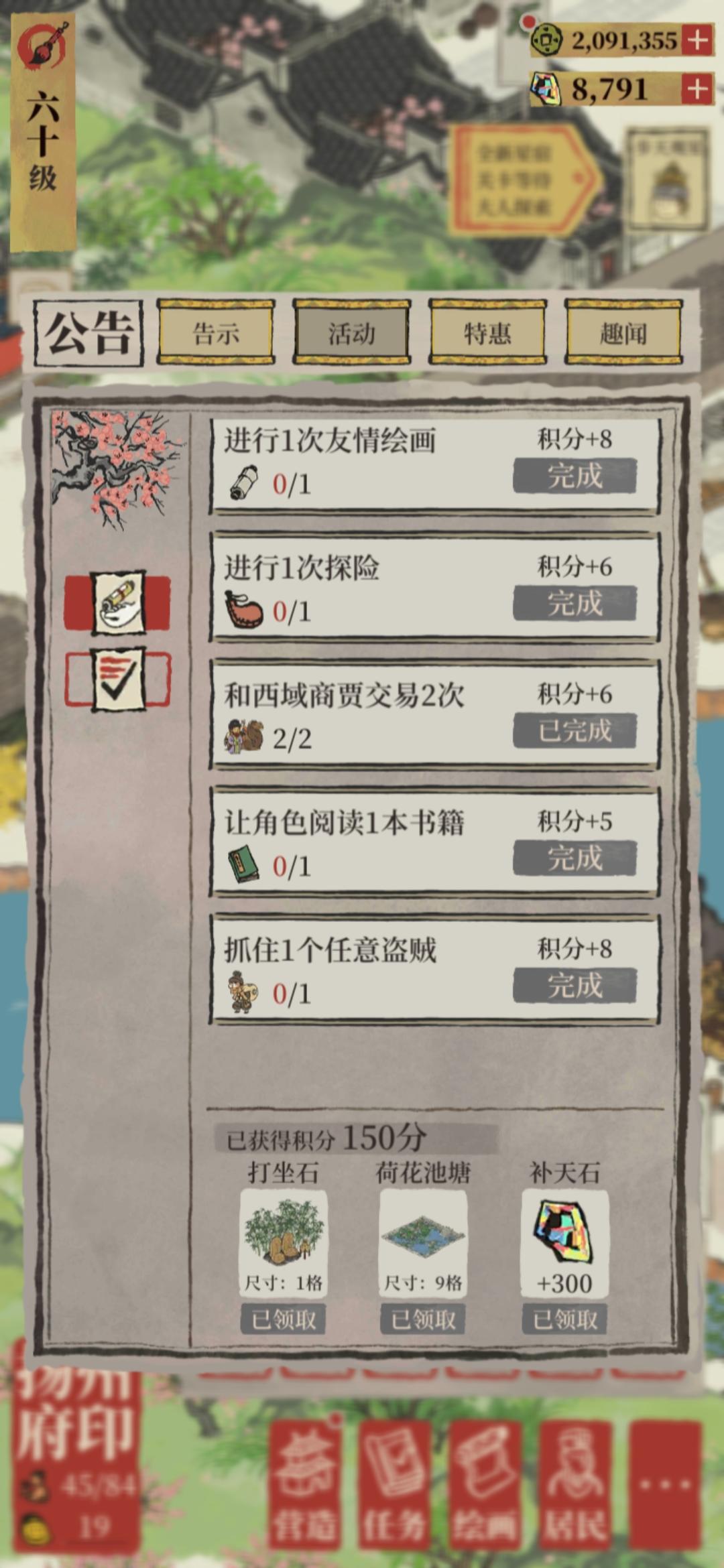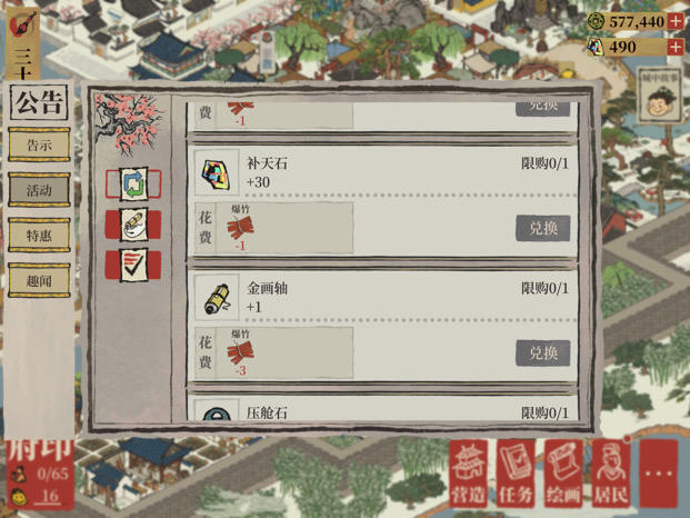 结果就在更新扬州、这波补天石累消、娱乐建筑打折......活动之前,甚至是最近一次的桃花村领奖尾声,我悠哉游哉在松江乱逛,因为金钱爆满也懒得安排居民干活的时候,突然说我丢失的378,补天石是我自己拿来补充体力了。我???