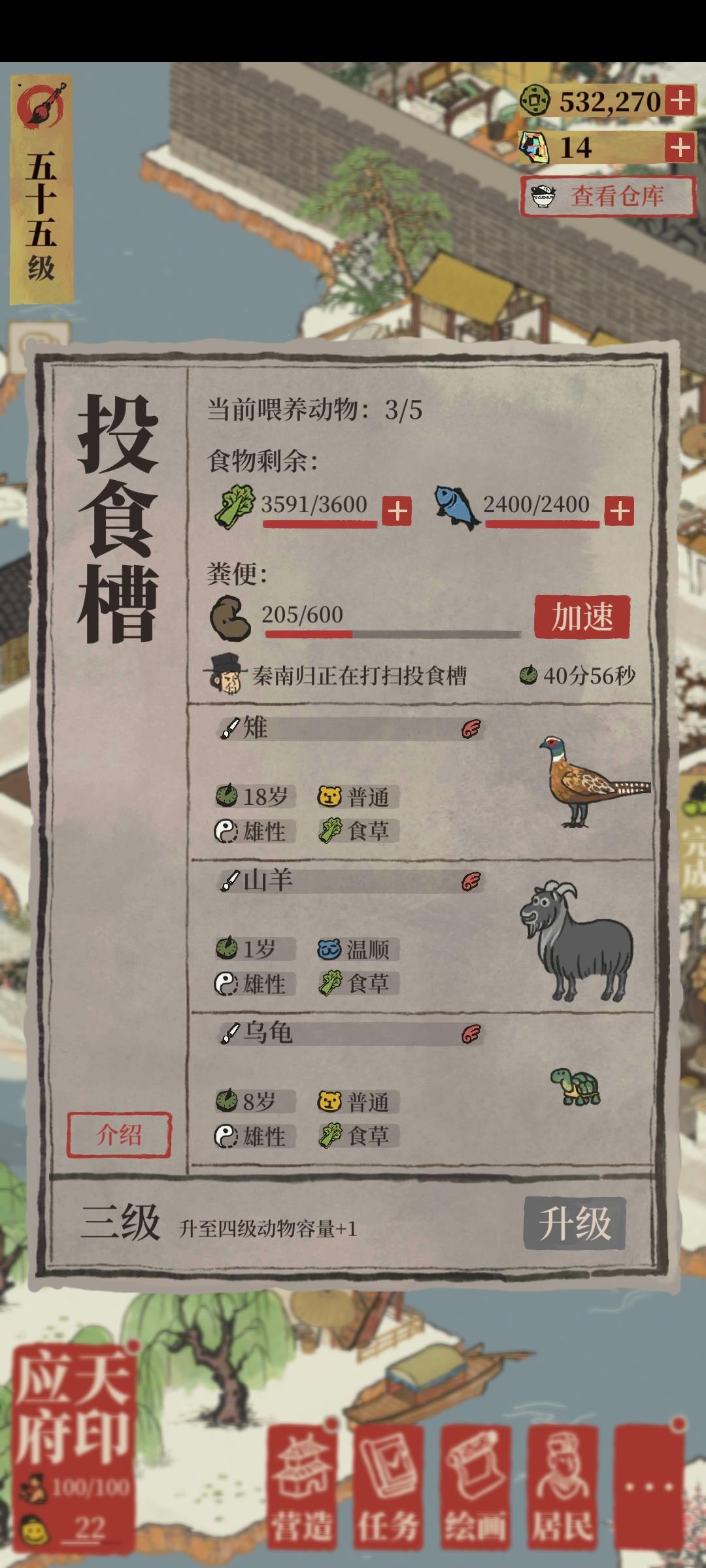 提个建议,投食槽一直以来都没有什么用处,动物又吃又拉没有产出,属实鸡肋,可以给一些小动物添加一些功能,比如黄牛可以耕种农田,加速种植时间,乌龟可以给商店商栈招财,老虎可以自动捕捉小偷倭寇,山羊可以啃食枯枝,小动物的粪便还可以肥田,增加种植产量,这样投食槽可玩性会大大增加,望官方采纳