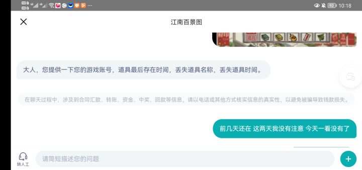 我的道具丢失了,由于前段时间删除人物,我获得了两个自选天锦囊,用了一个换了沈周,另外一个不知道换谁,所以一直没有用,结果19号的时候突然发现我的那个锦囊不见了,然后我立马去找客服反馈,结果到现在也没有答复,找客服也一直说工单待处理,那么,像这种非常稀有的的道具,丢失的话玩家会发现,如果是其他的呢,会不会有丢失玩家也不知道的情况??
