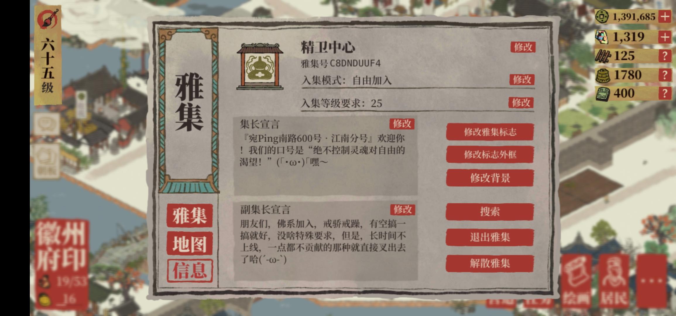 欢迎加入精卫中心(雅集号:C8DNDUUF4) 『宛Ping南路600号•江南分号』欢迎你! 朋友们,佛系加入,戒骄戒躁,有空搞一搞就好,没啥特殊要求,半个月不上线,一点都不贡献的那种就直接叉出去了哈(´-ω-`)