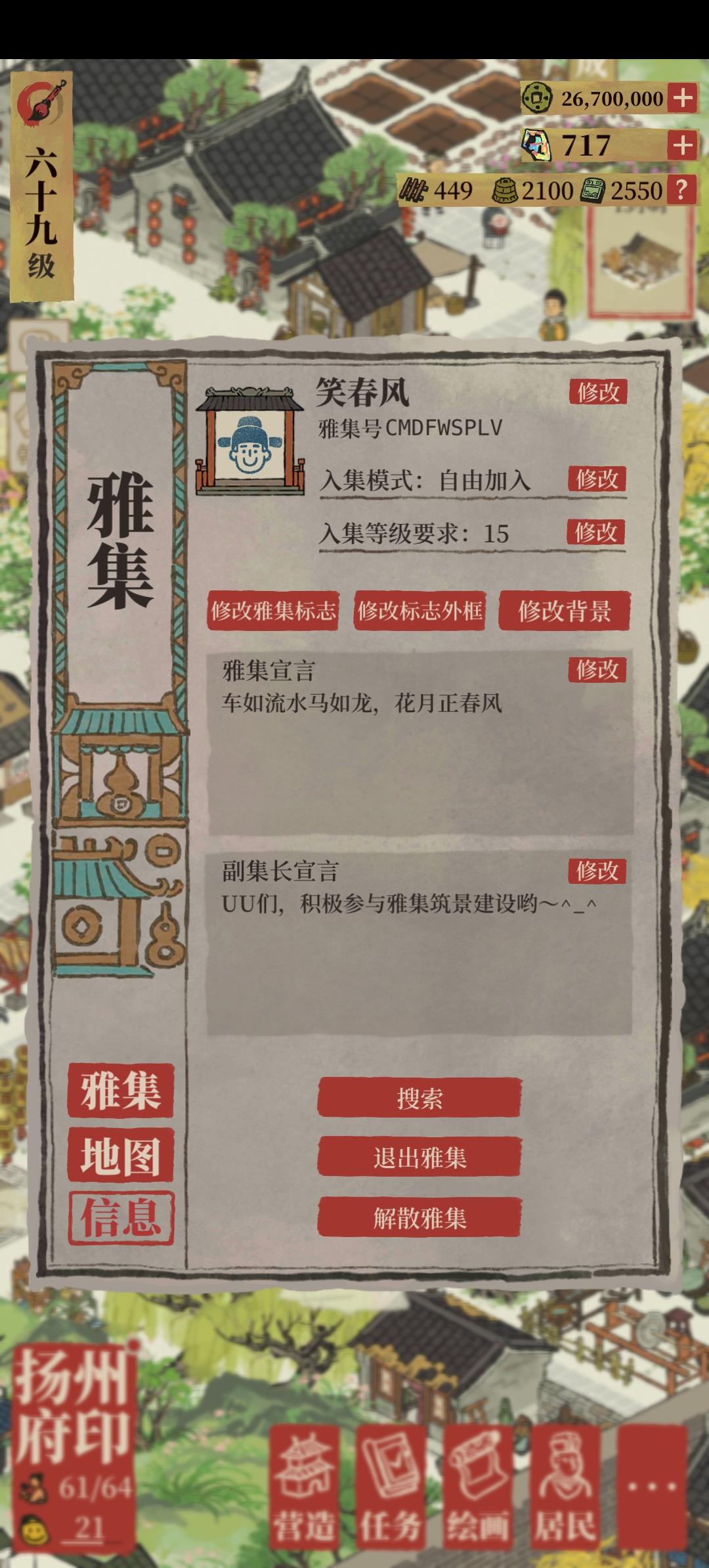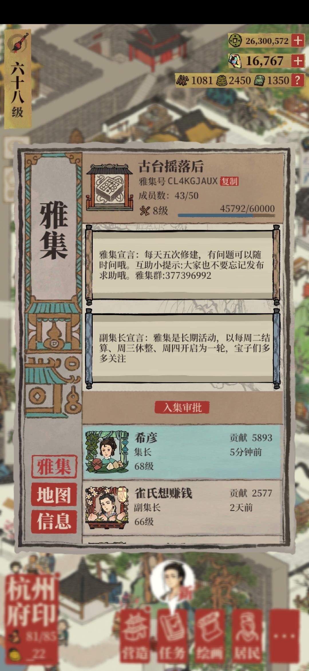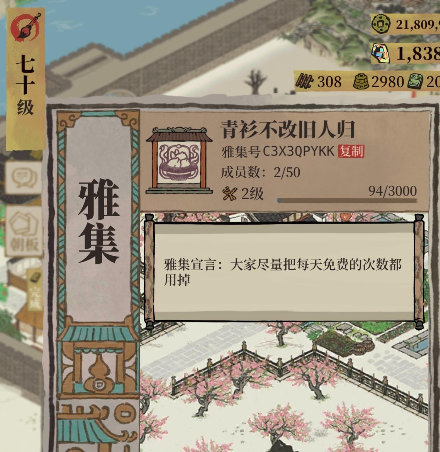 八级雅集 雅集号:CL4KGJAUX【古台摇落后】 ⭐群号:377396992八级雅集 现在空出七个位置 30级即可 佛系雅集 每一期都可完成 要求不高只要提交材料就行超过十天不上线且贡献很少的会被请出欢迎加入呀😉