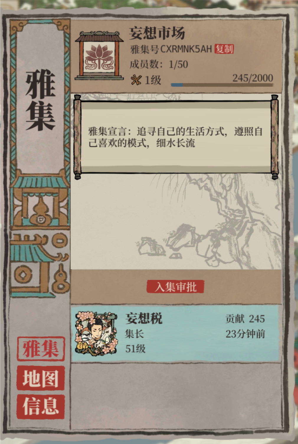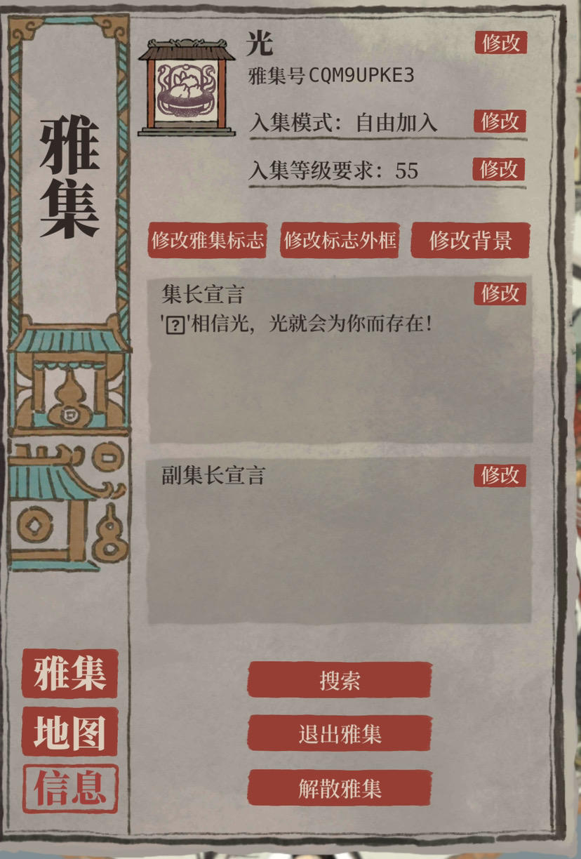 雅集招人 雅集号C9Y96XFMV 佛系雅集,在线撩人 目前27人, 条件:活动期间每日做点任务,一期结束后,会踢掉贡献为0的人,以及不登陆游戏超过30天的人不需申请,直接加入