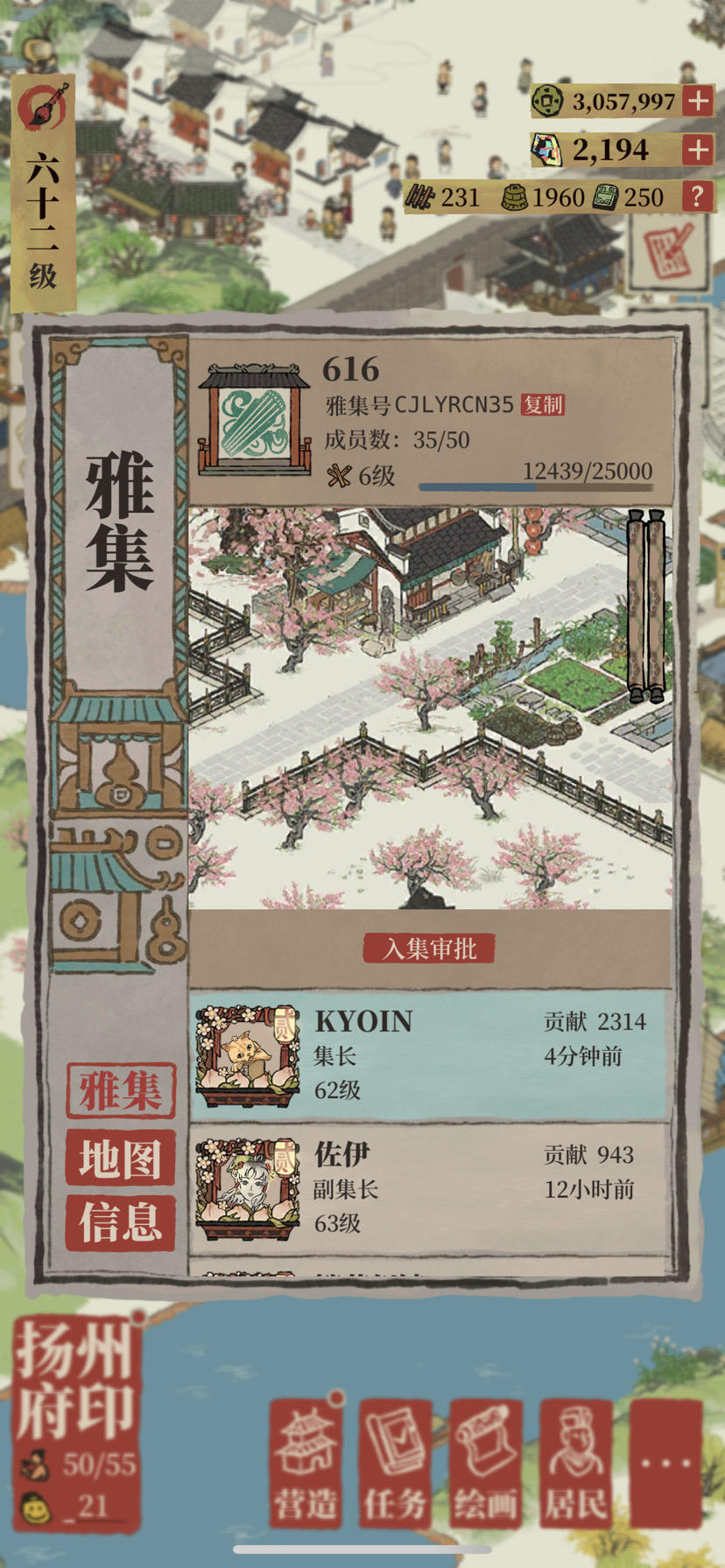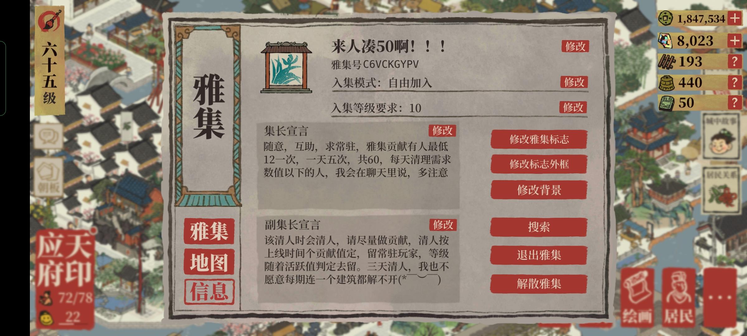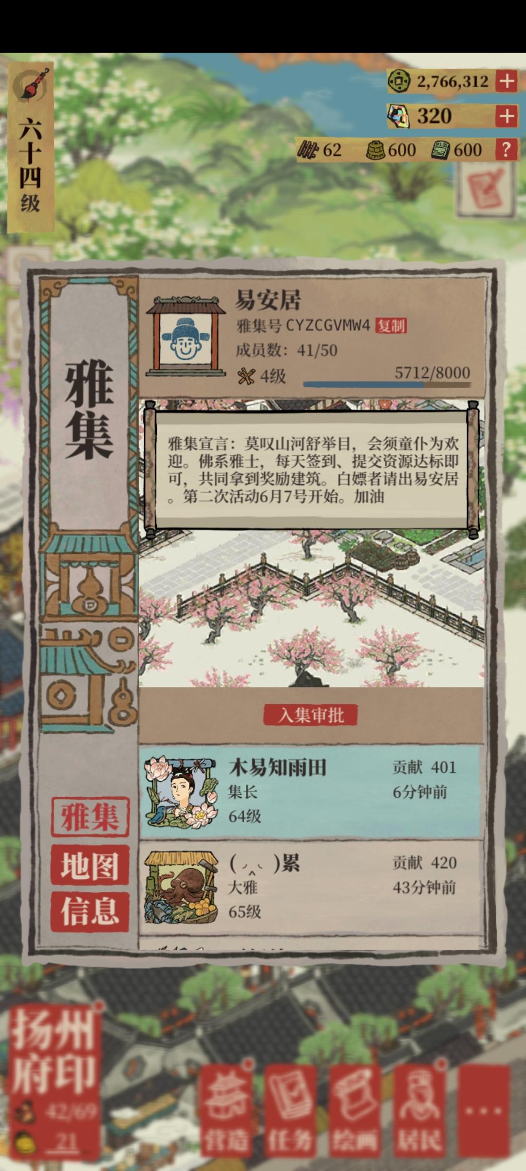 雅士召集:有9个位置名字:易安居雅集号:CYZCGVMW4易安居里都是认真做任务的,白嫖者基本清光。要求:55级以上,能够每天签到、求助、提交资源增加贡献值达标。为避免有白嫖者进入,进雅集说暗号才能审核通过。非诚勿扰,对谁都好。宣言:莫叹山河舒举目,会须童仆为欢迎。佛系雅士,每天签到、求助、提交资源达标即可,共同拿到奖励建筑。白嫖者请出易安居。第二次活动6月7号开始。加油