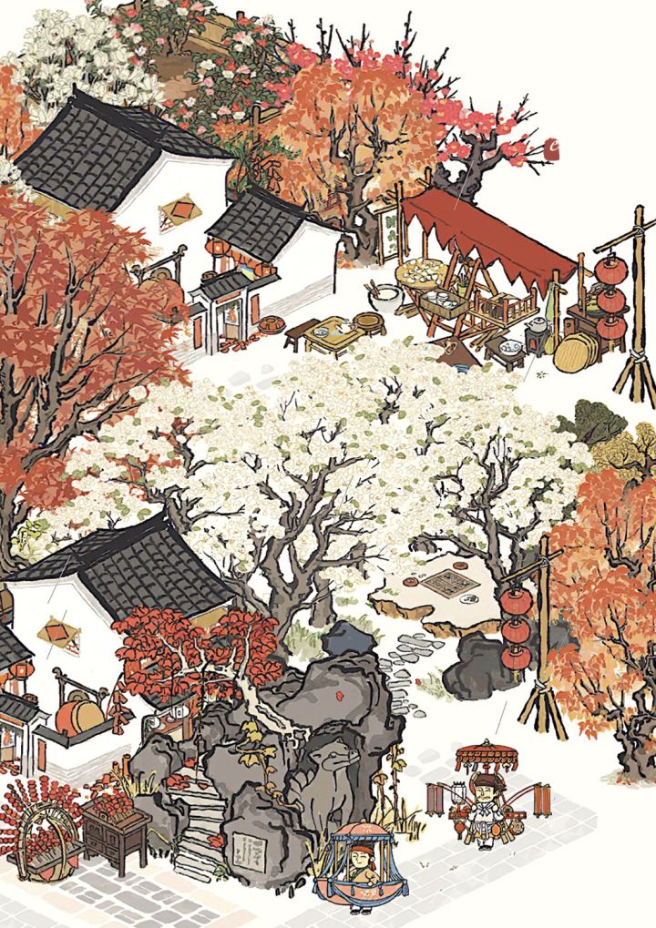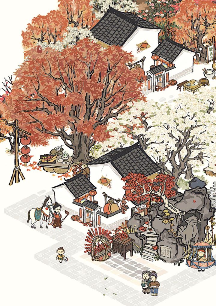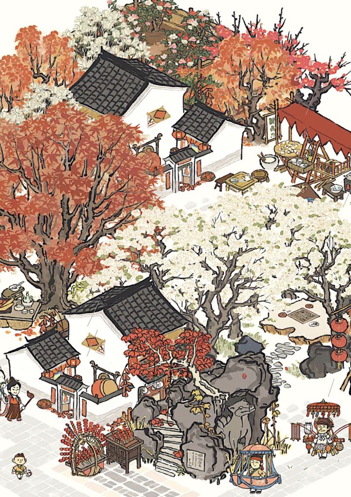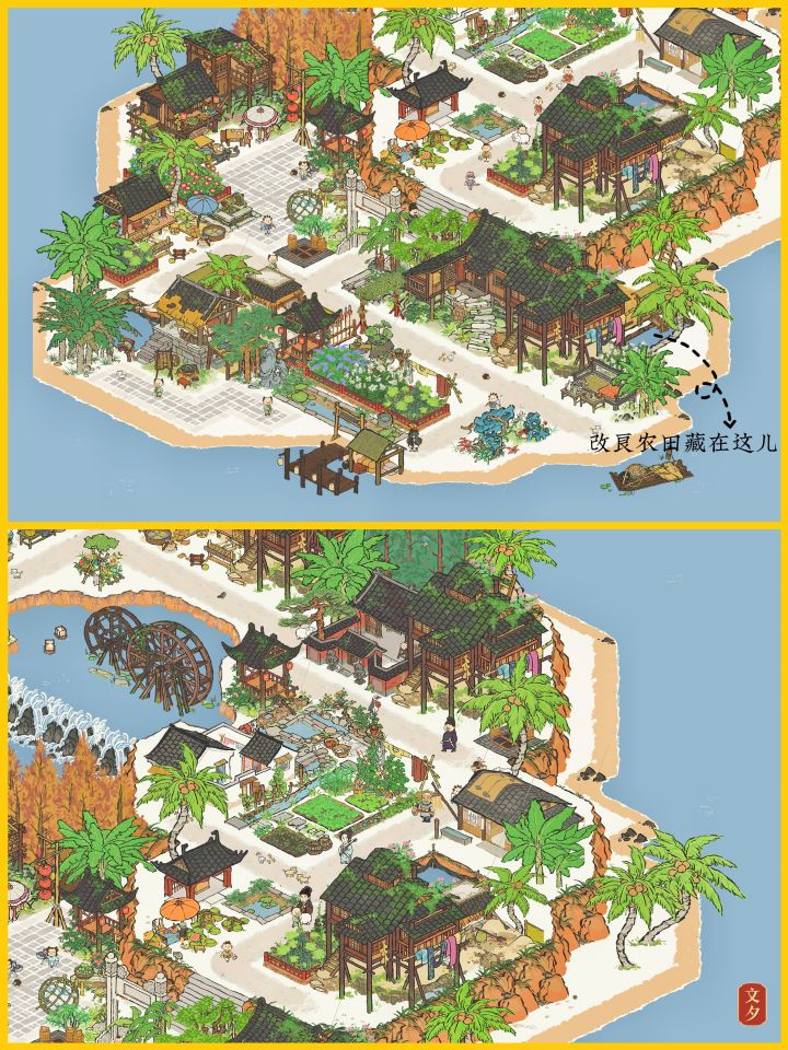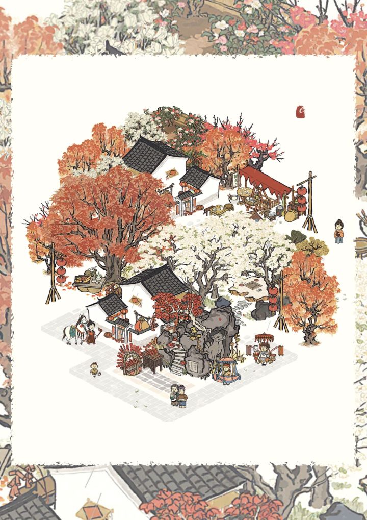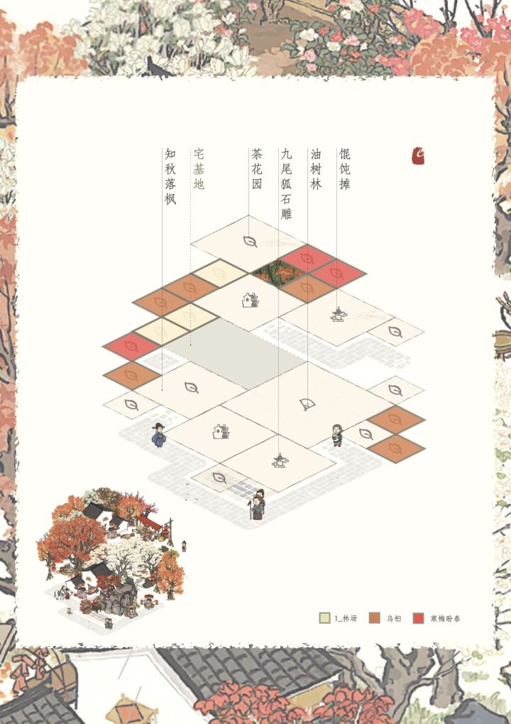 🍂小景·秋日村落🍂喜迎佳节,喜气洋洋~💡小说明:图中“宅基地”的位置可藏仓库、生产建筑,灵活好用,谁用谁知道~🍂主要建筑:九尾狐石雕·知秋落枫·油树林·馄饨摊·茶花园·四级民宅#江南百景图