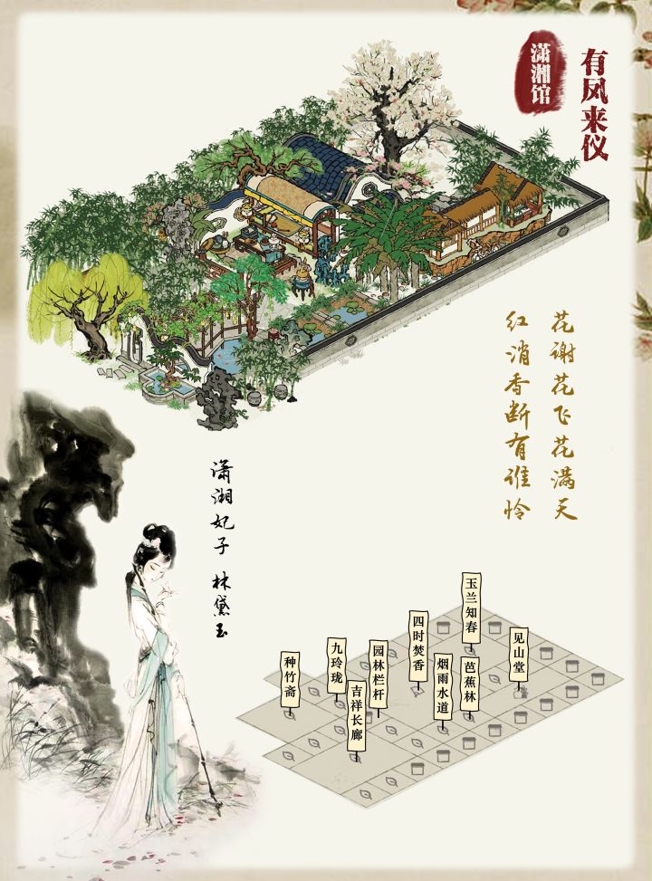 扬州府大观园布局 之 潇湘馆“我心里想着潇湘馆好,爱那几竿竹子隐着一道曲栏,比别处更觉幽静。”主建筑:四时焚香,玉兰知春,吉祥长廊,见山堂。扬州府没有竹子装饰,还好有打坐石和竹间雅座,真的很难我还做了视频解说,有人想看吗,我尽力贴合原文了!大观园全局完整布局在这里: