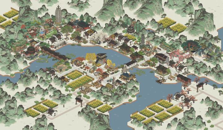全局:在徽州及其名下县衙内均打算以金、黄、橙等颜色为主,主打与秋色情景融合,正好利用这一季的秋季建筑打造成一个秋景县衙。婺源县同徽州府相似,有大量群山峻岭分割土地,依旧利用许多自带山崖的建筑与之融合过渡,自然布局。【清华源】因此地描述为清溪萦绕,有横跨水面的彩虹桥,此地恰于池边,依山建造在此布局白露岩寺,恰巧可以与热海蒸云结合在一处,形成山下温泉的景观,岳阳楼自带的山崖与婺源县的山颜色相近,也