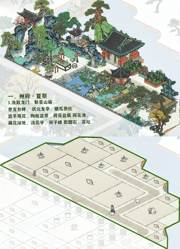 原则:“路路通”>美观>合理分区>buff加成。一、州府 本官的宅邸后靠魁星山,右邻牡丹亭,前有古柳飘飘~平日免费开放,宵禁时间三道门一关就是本官的私人花园。二、贡院位于州府旁的贡院,正门出来有热闹的集市,左侧是冬春交替的美景,后方有绝美的牡丹亭。三、造船厂位于贡院旁集市旁,三面环河,水面宽阔,方便试水。四、驿站位于州府、贡院、娱乐区中心交汇处的城外,城墙内正对天妃宫,