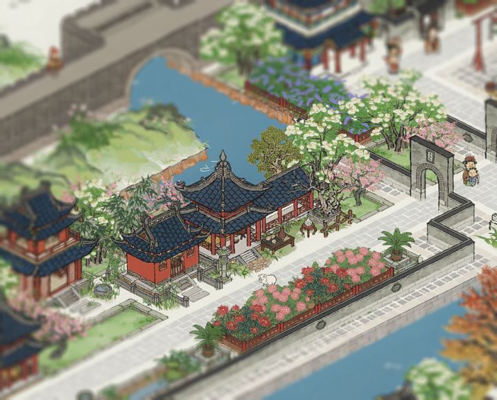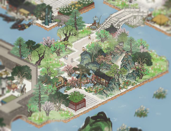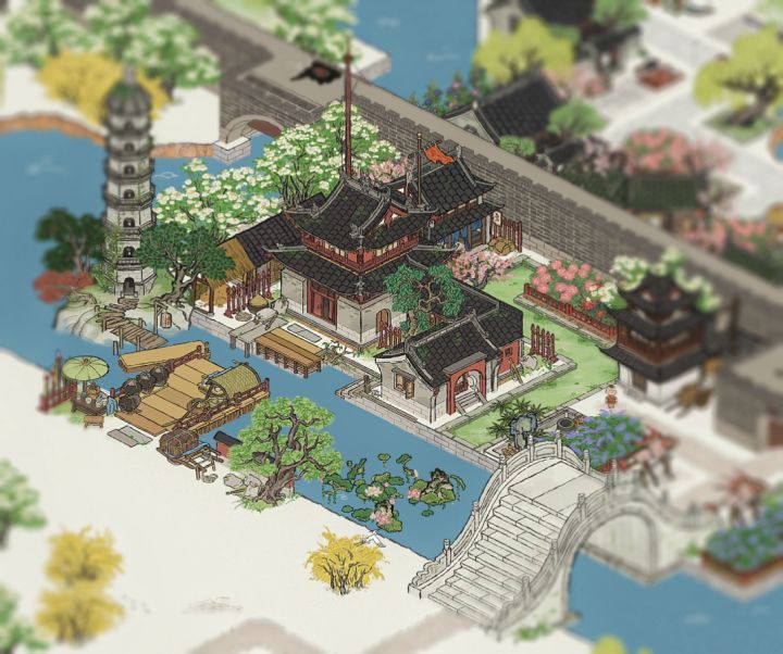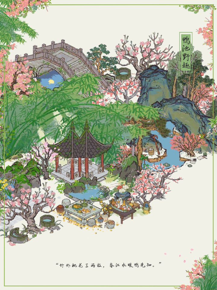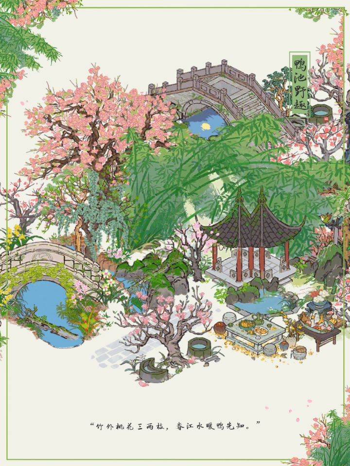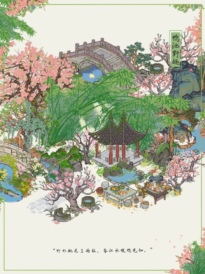 🌸“竹外桃花三两枝,春江水暖鸭先知。 ”🍃江南百景图|鸭池野趣布局✨主要建筑:鸭池野趣、去年桃花、胜方亭、月影桥、会稽山阴、日月井、桂花宴、镇暑冰盘#游戏安利#游戏推荐#游戏讨论