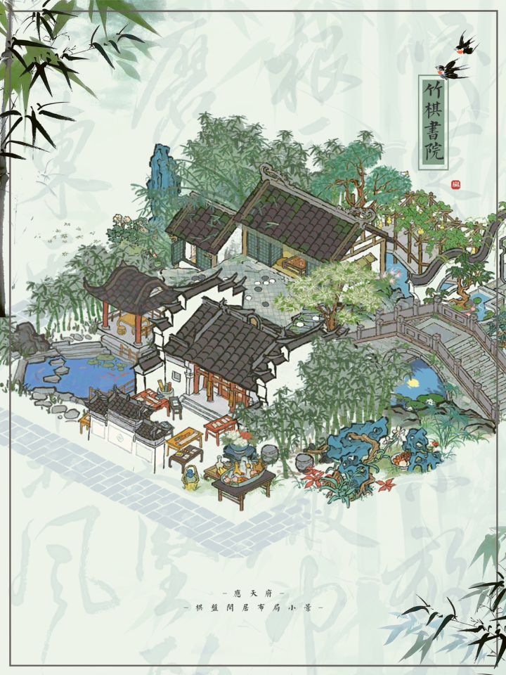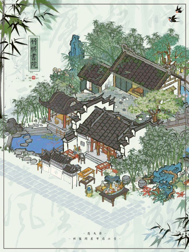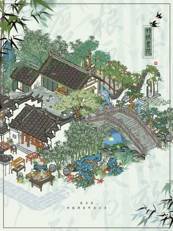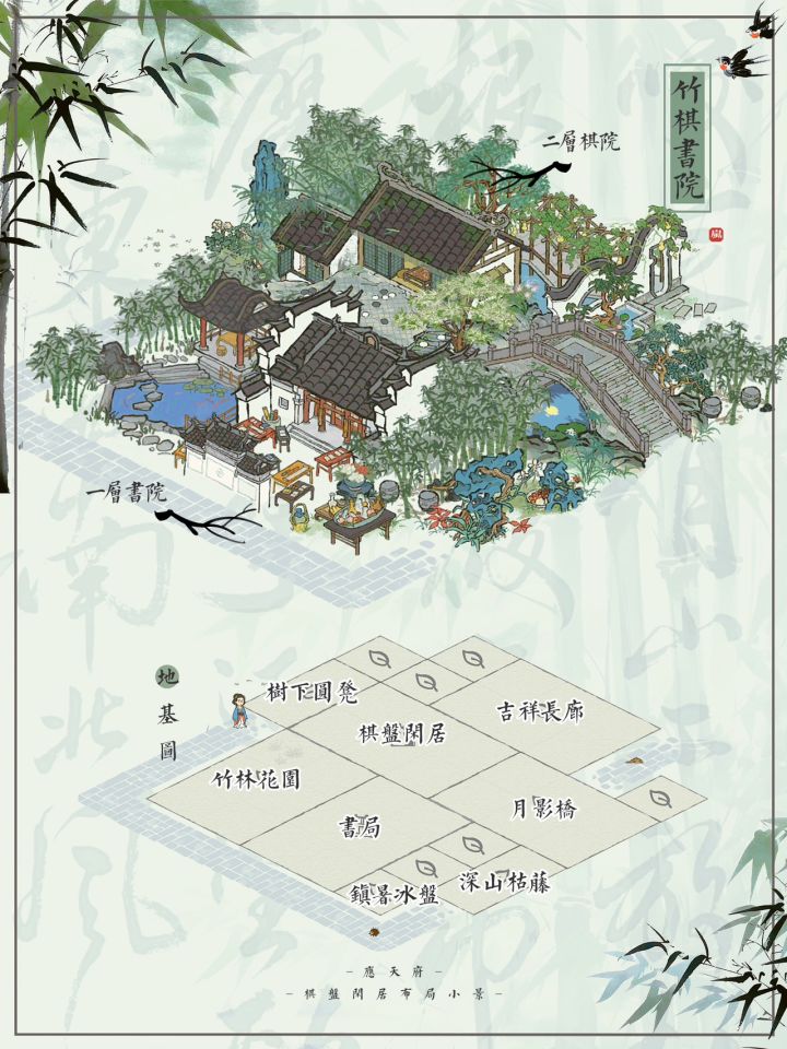 🎋竹棋书院|江百棋盘闲居小景布局🍃江南百景图|限时漕运建筑棋盘闲居布局💚主要建筑:棋盘闲居、书局、竹林花园、吉祥长廊、树下圆凳、深山枯藤、镇暑冰盘、月影桥🎋此布局用棋盘闲居的视觉差仿造了一个有平台的二楼棋屋,一楼为书院。