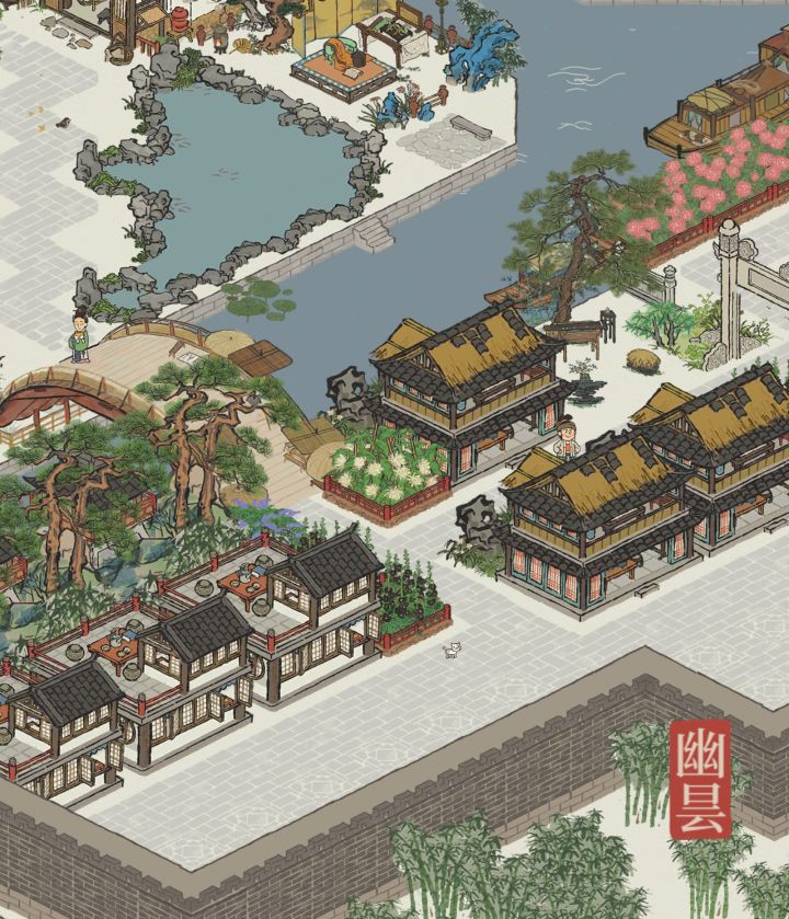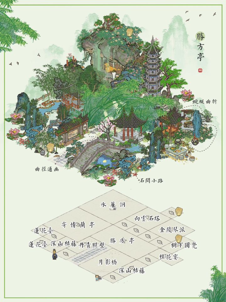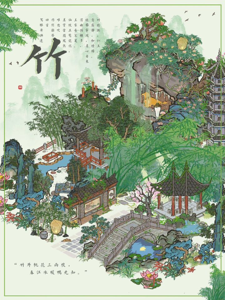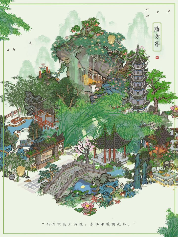 🎋江南百景图✨新建筑胜方亭布局✨有地基🍃“竹外桃花三两枝”✨主要建筑:胜方亭、水帘洞、寄情兰亭、深山枯藤、树下圆凳、月影桥、丹青照壁#游戏安利#游戏推荐#单机游戏#国产游戏