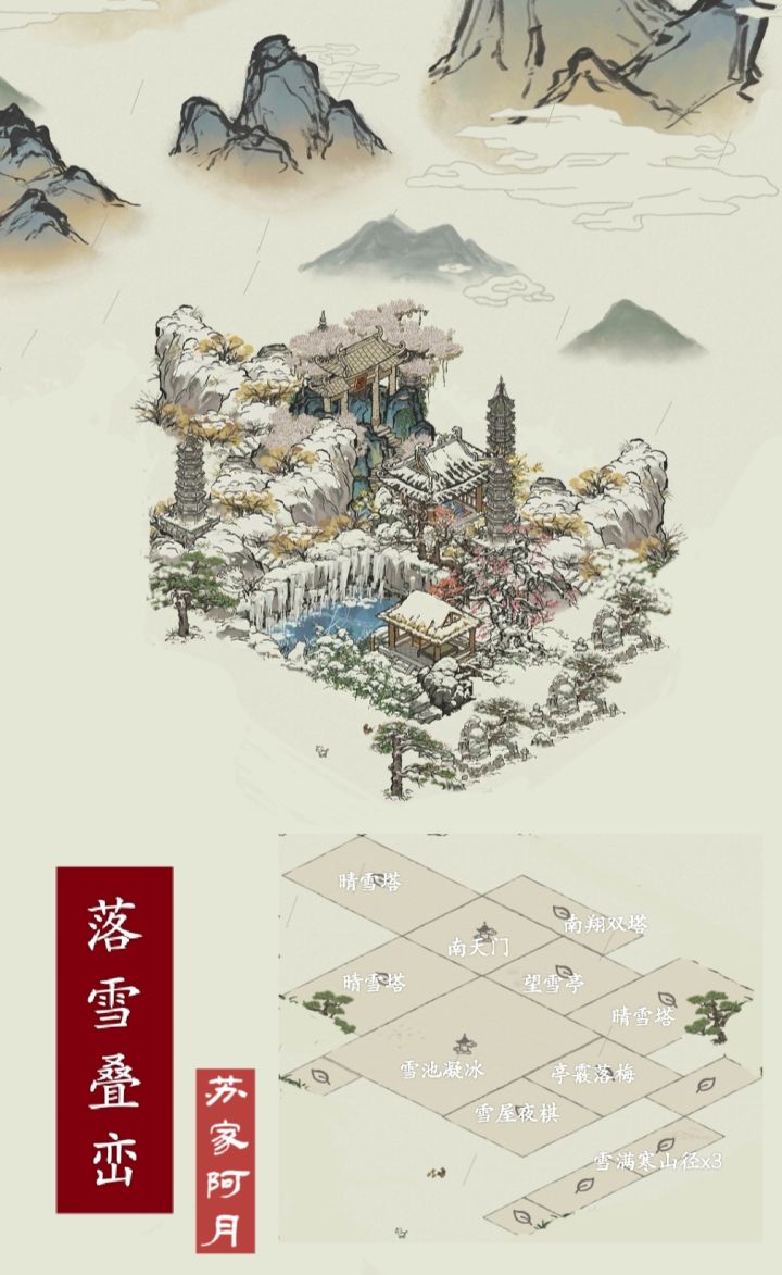 一.落雪叠峦南天门的垂枝花看起来很适合雪景,感觉搭起来的话一定有一种仙气,奈何搭来搭去还是不如意,最后好像成了适合游人踏冬的感觉。好像还能看得过去,暂时先放这里。tips:晴雪塔那里可以用南翔双塔加个增高~ 如果塔放多的话这样看起来就不会显得千篇一律了。二.廊华挽雪本来想搭个回廊,结果搭成了拐廊hhh千树梨花 放中间,幕帐的颜色和水差不多,这样就有种整个长廊都在水上的感觉。tips:配