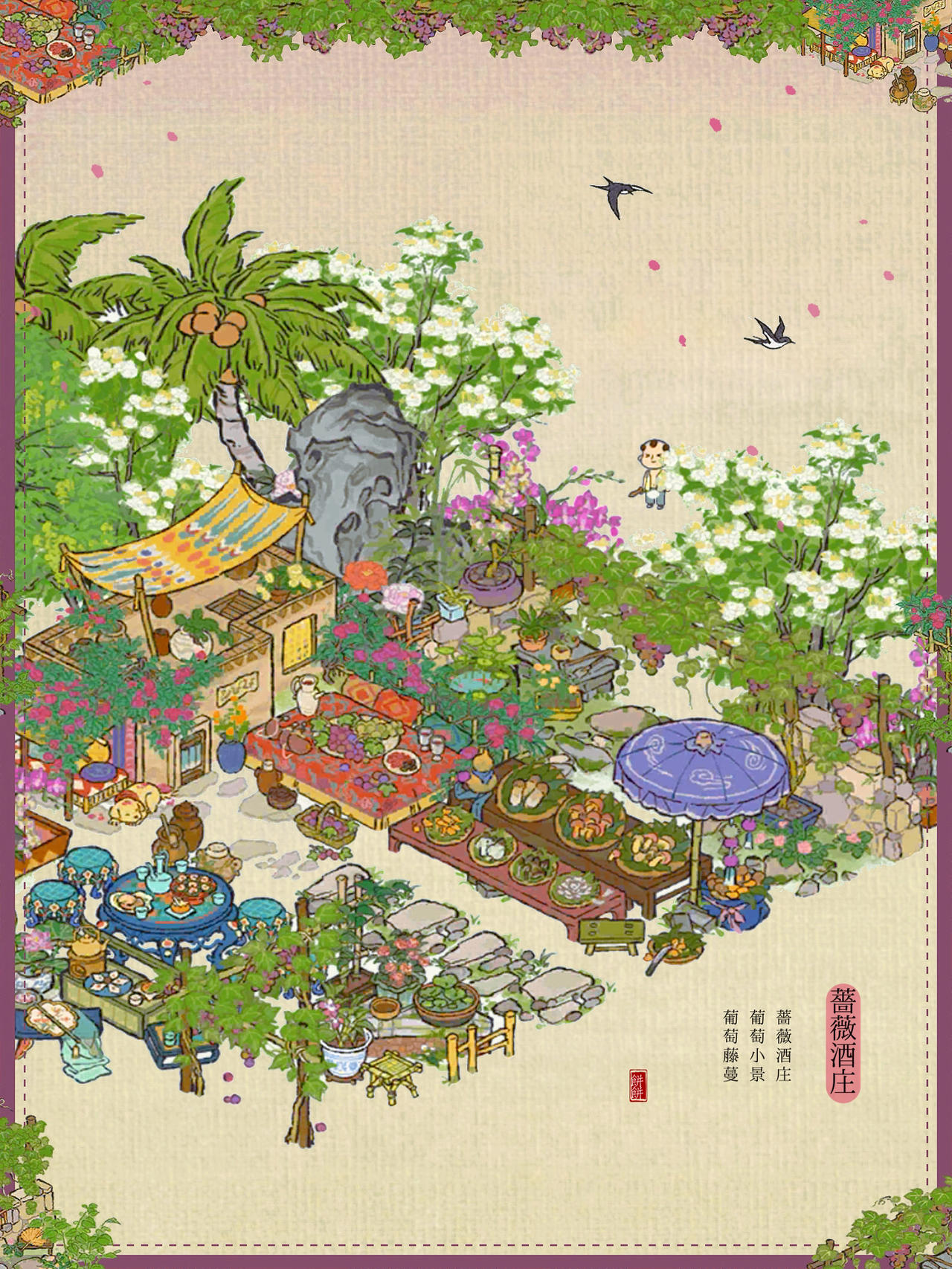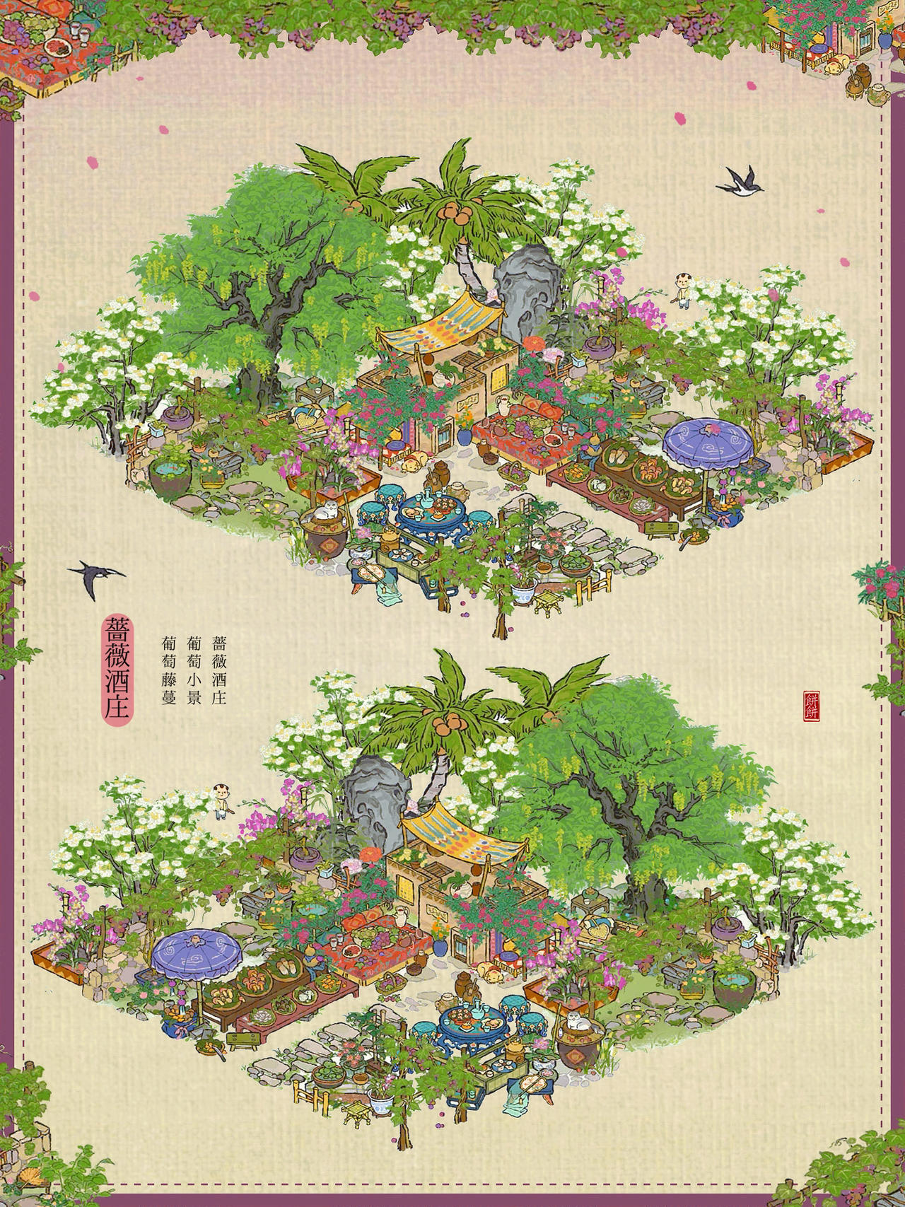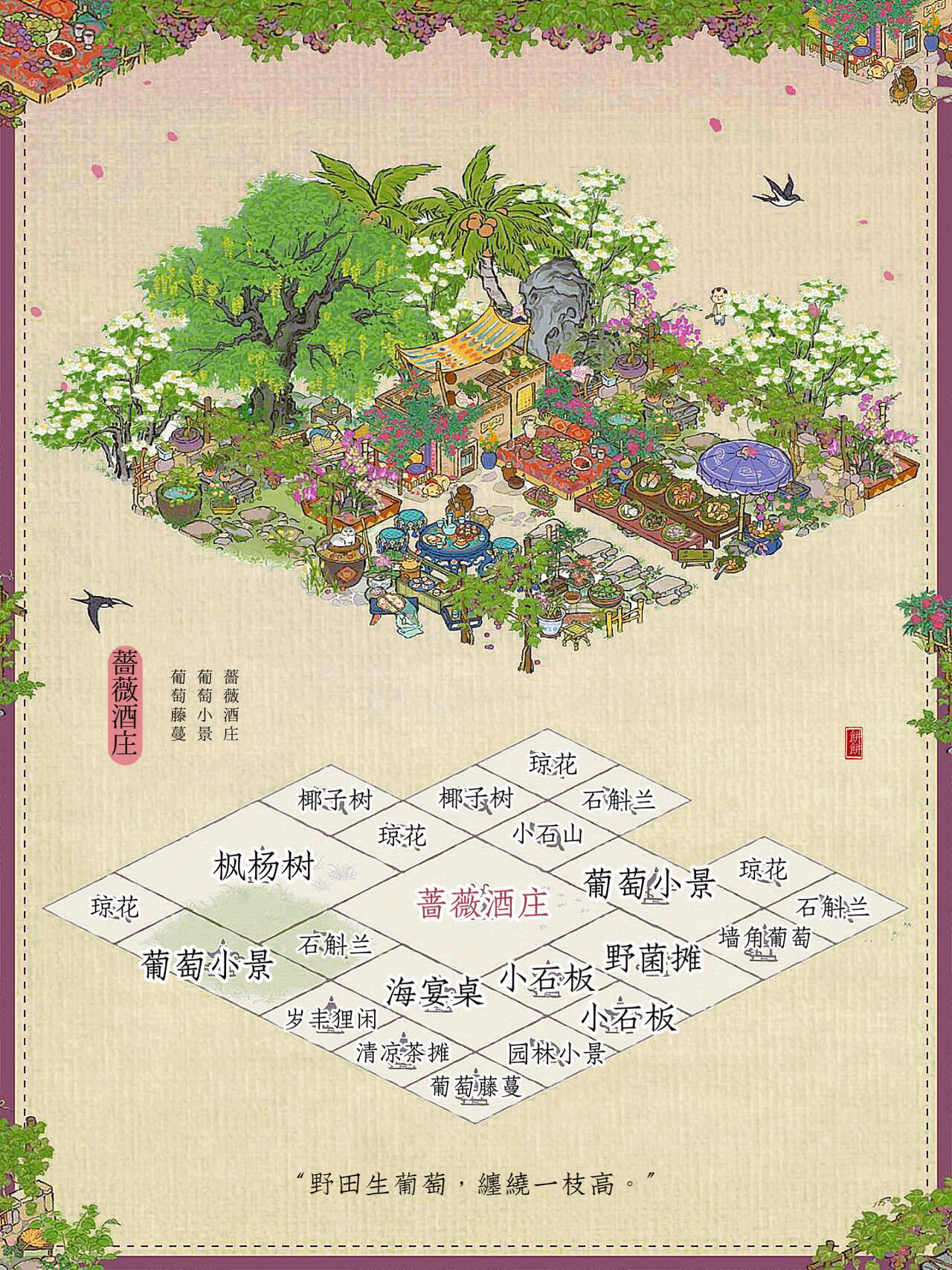 建筑:蔷薇酒庄、葡萄小景、葡萄藤蔓、墙角葡萄、亭亭枇杷、合欢小院、绵绵生瓜藤、花篱犬舍、荷落犬眠、岁丰狸闲、瓮下乘荫、农家栅栏、桂花宴、清凉茶摊#江南百景图 #江南百景图布局