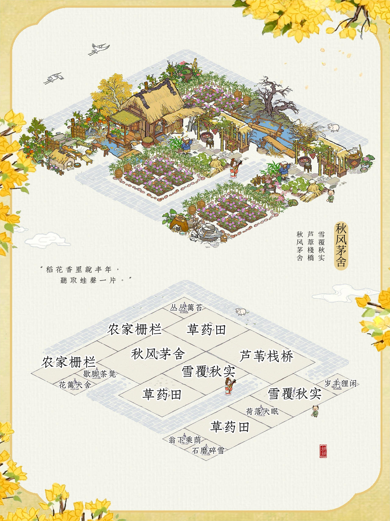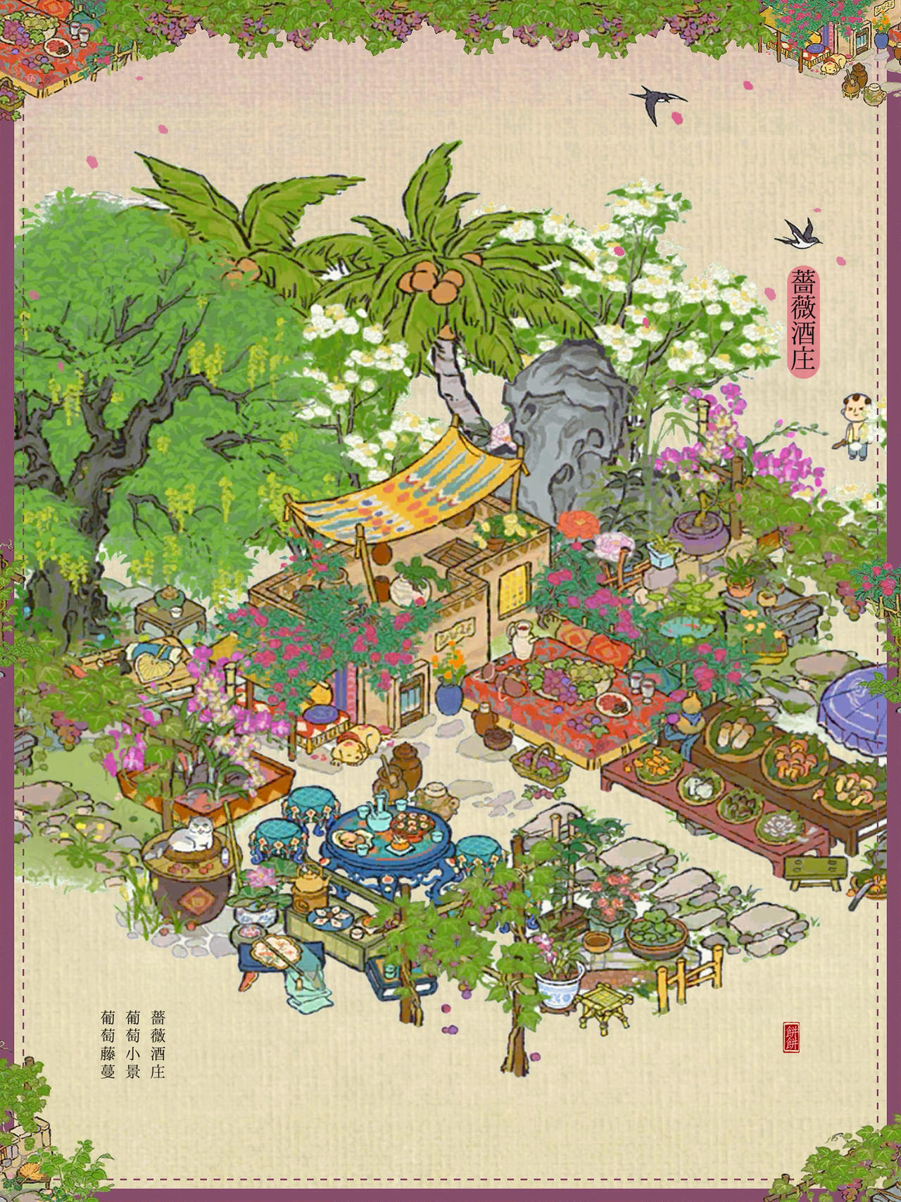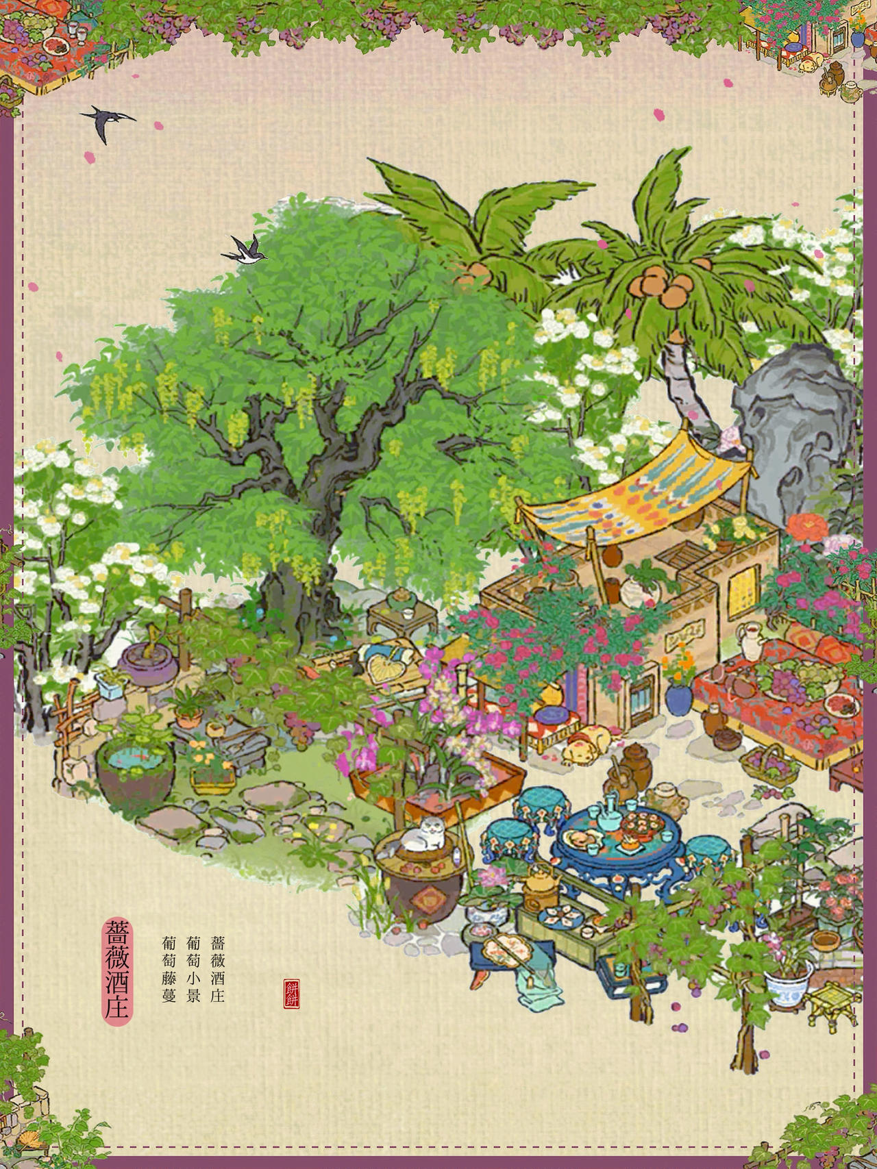 建筑:蔷薇酒庄、葡萄小景、葡萄藤蔓、墙角葡萄、亭亭枇杷、合欢小院、绵绵生瓜藤、花篱犬舍、荷落犬眠、岁丰狸闲、瓮下乘荫、农家栅栏、桂花宴、清凉茶摊#江南百景图 #江南百景图布局