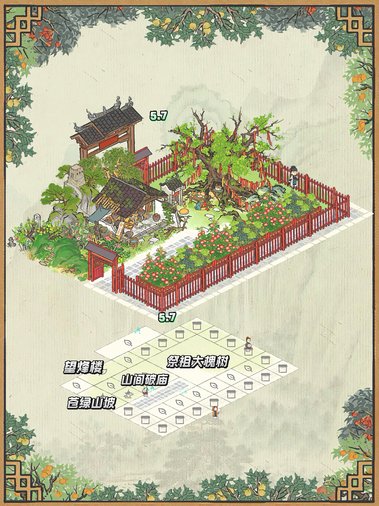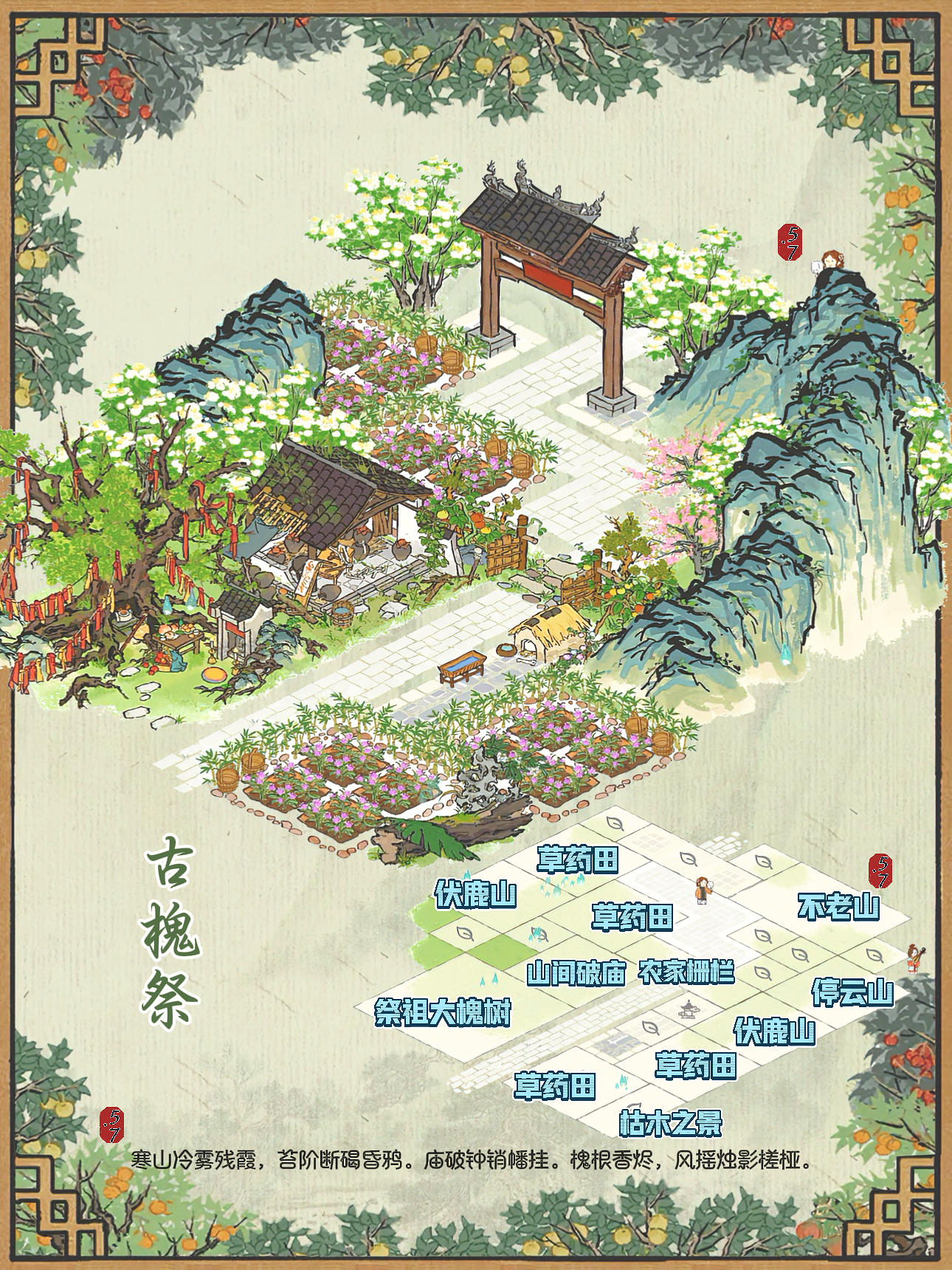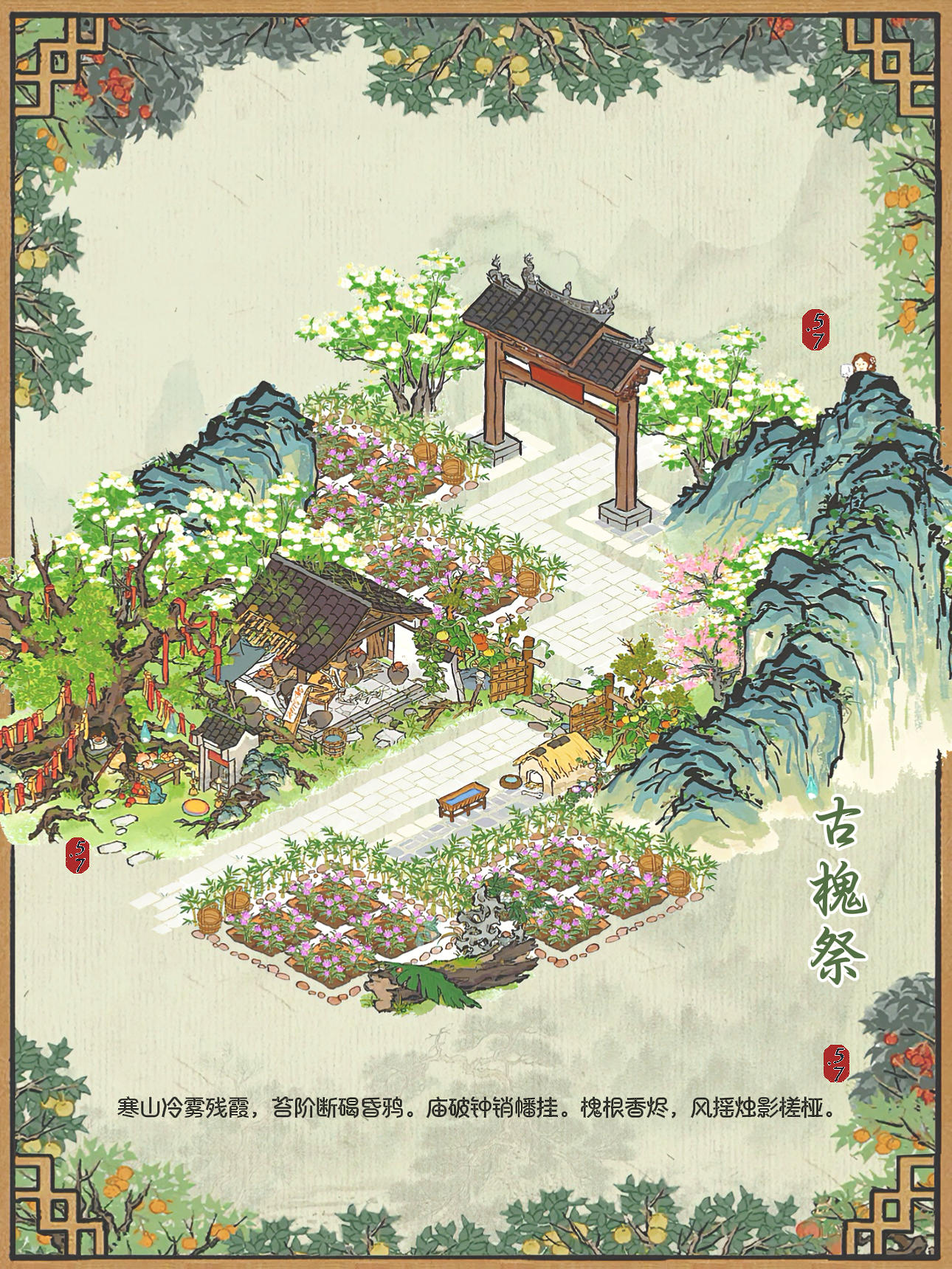 该说不说,两个看着破破烂烂的建筑就各种意义上来说有点配。 #江南百景图布局 #江南百景图 共2个布局,最后一张图是大槐树的小布局。 建筑:祭祖大槐树、山间破庙、伏鹿山、不老山、停云山、草药田、苍绿山坡、望烽楼