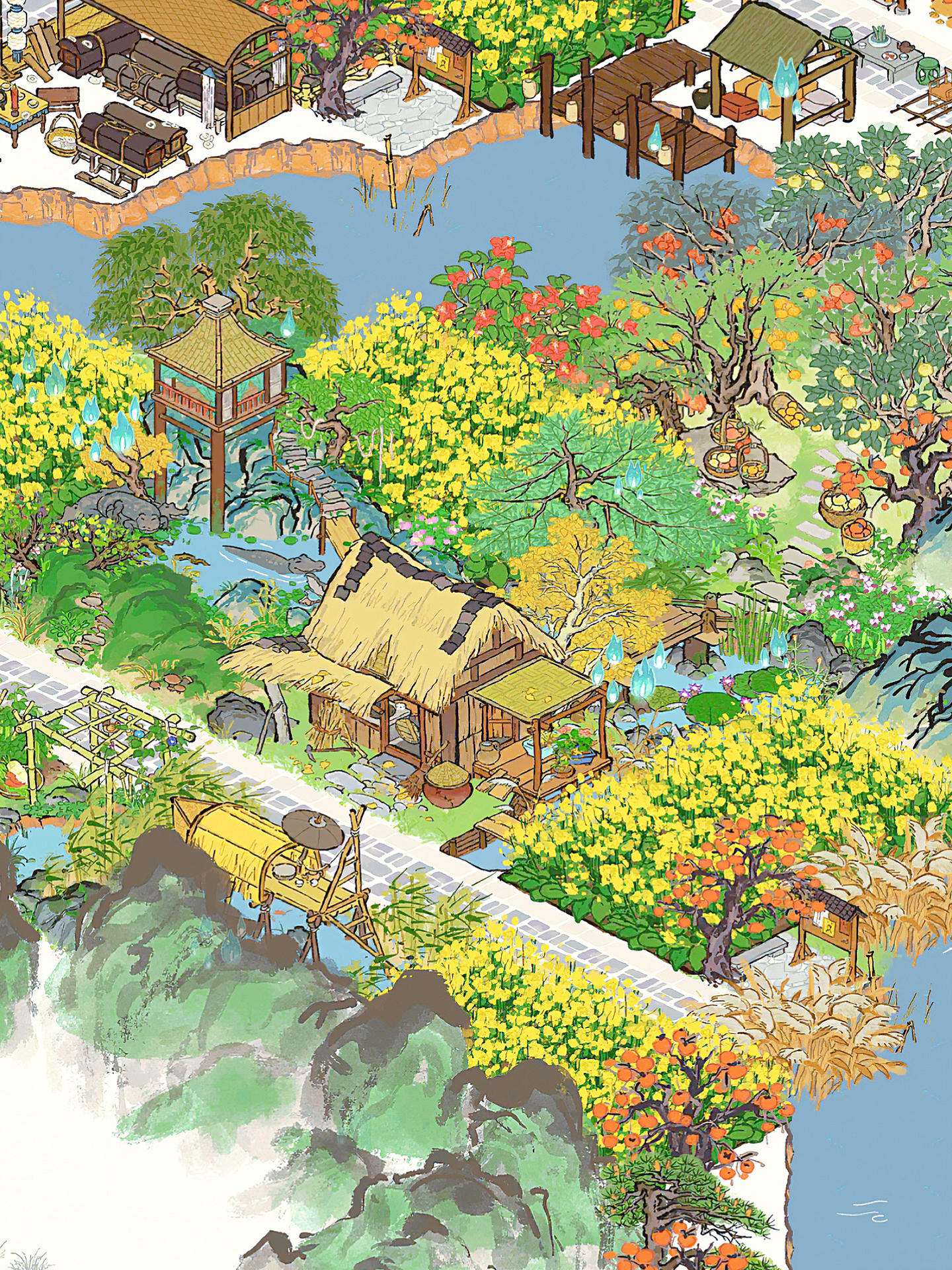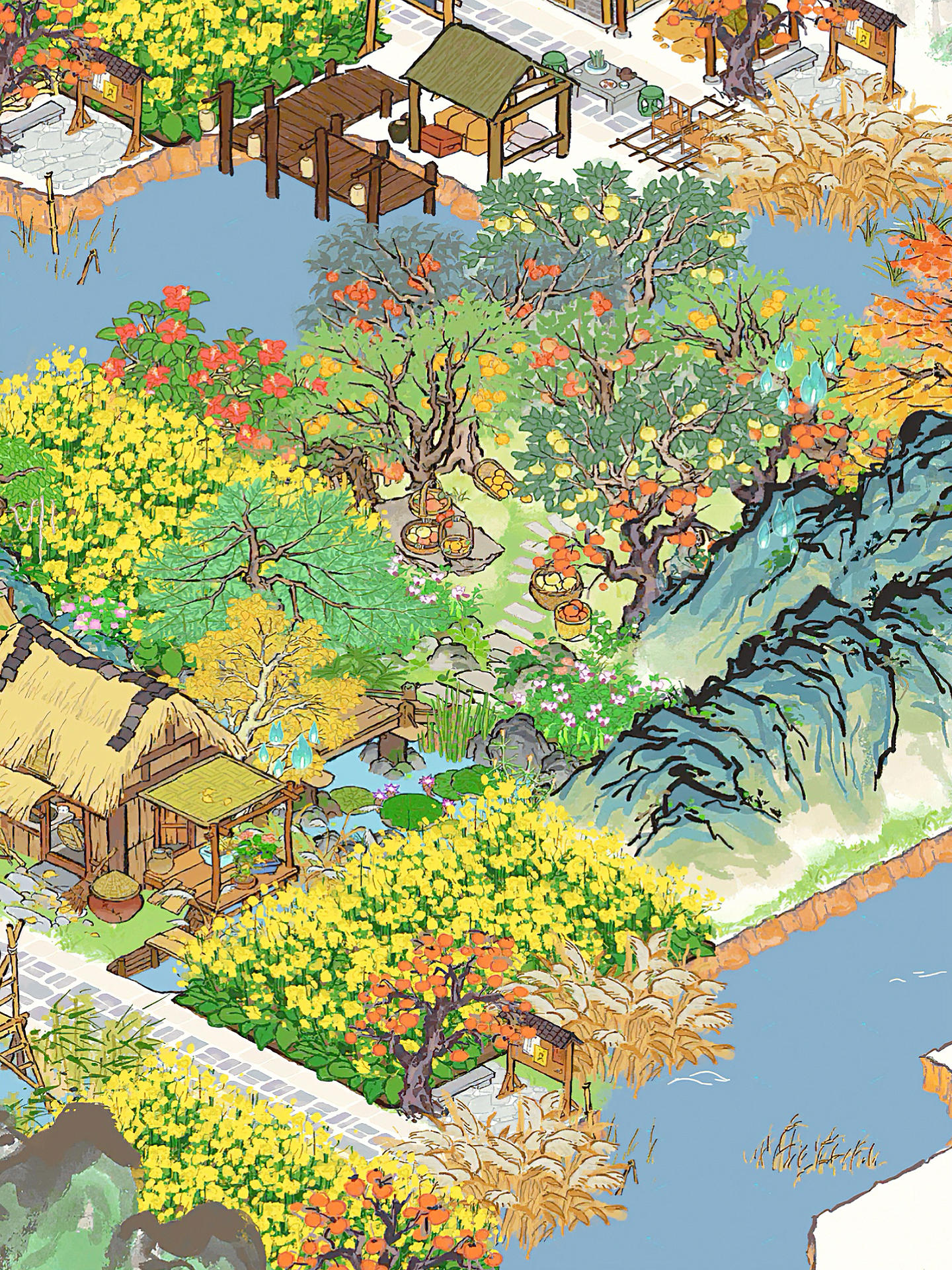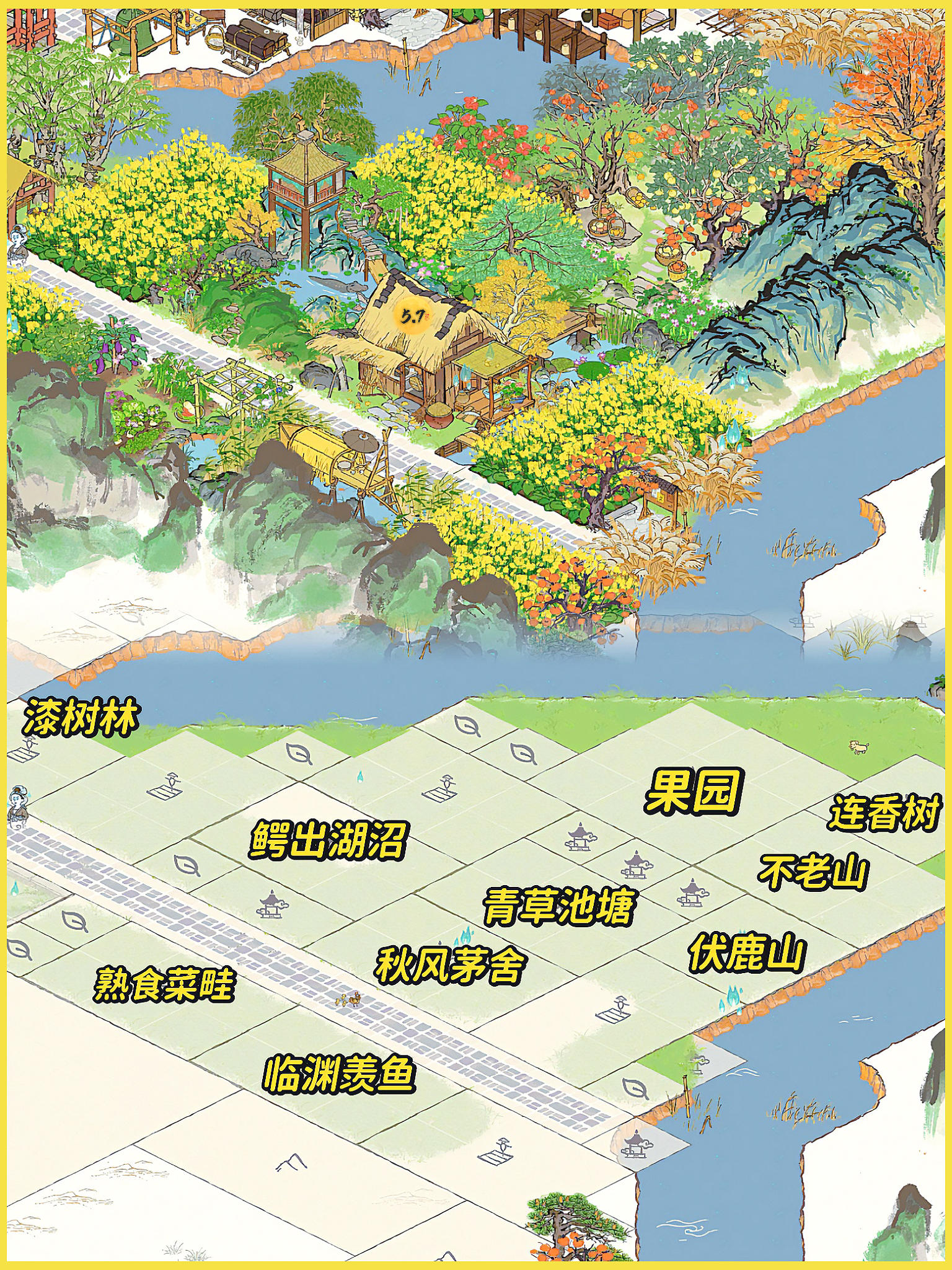 建筑:连香树、秋风茅舍、果园、鳄出湖沼、青草池塘、临渊羡鱼、熟食菜畦、不老山、伏鹿山、苍绿山坡坐标:徽州府·和业巷|枕籍巷#江南百景图 #江南百景图布局 #江南百景图徽州府