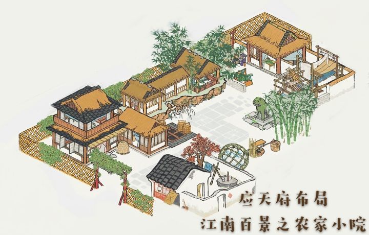 大家好,我是意识流布局的冬日暖阳~江南百景第二十三景:农家小院!双层草屋和斗茶摊的可搭配性真的很高!和应天府的云锦织坊、杭州府的折扇作坊团扇作坊、松江府的五级煮盐场四级制鞋场、四级仓库、大部分生产建筑等都可以搭配!丑狮子也很可爱,绿色狮子放在哪里都很和谐~一级民宅有种朴拙感,很适合营造农家氛围~好啦,这张布局就分享到这里,我叫冬日暖阳,下一张再见~