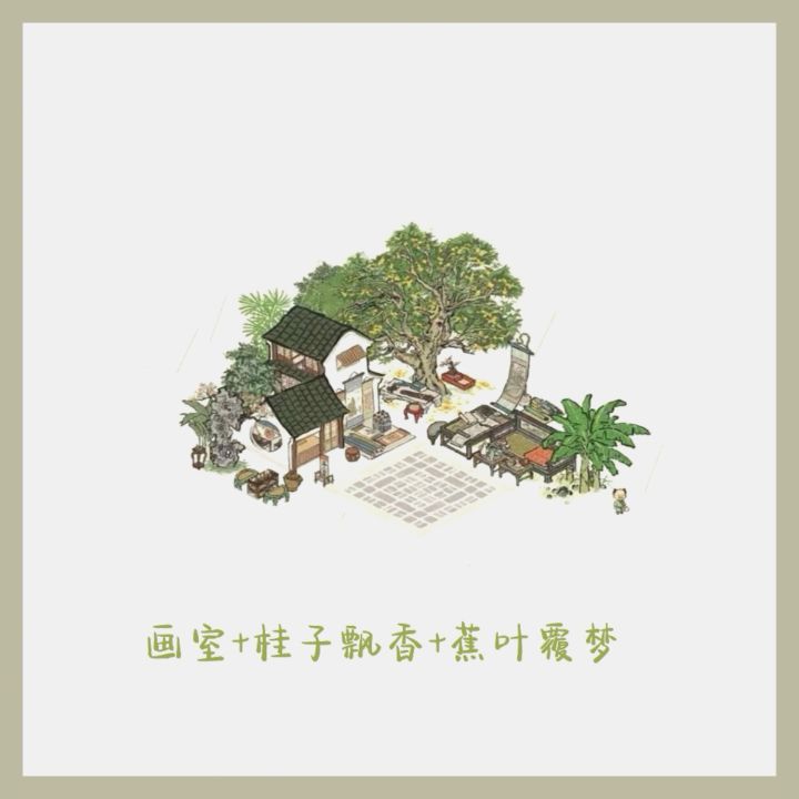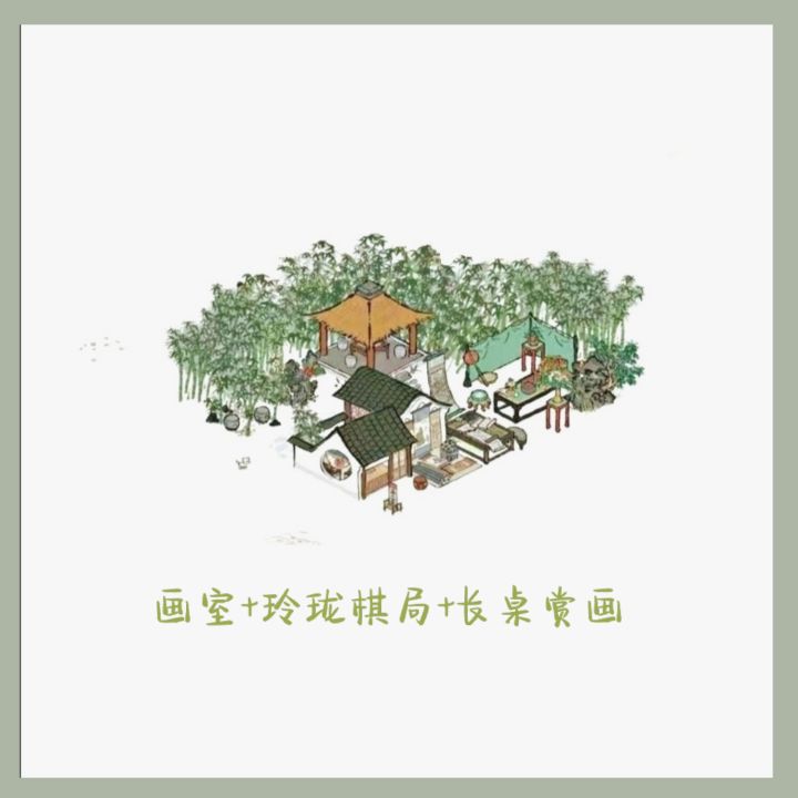 本来在凹畅音楼造型,拎出来几个同色系的建筑,摆着摆着发现除了畅音楼,其他建筑都很搭就出来这么一个丝滑的无缝衔接布局小院荷池和洞门的路连接月影桥和小院的边缘连接过坎有鱼和临池棋院的路连接💙