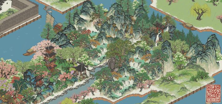 山逸亭布局——栖山柳谷山逸亭与腾龙壁紧邻铺成绿地打底,背后岚栖山形成地势差,左边停云山,伏鹿山,不老山相连形成线性阻断同时强化地势落差,右边伏鹿山横接愁空山与鹤鸣山,使木梯相连增强山体多样性,中间不断穿插柳树提升错落感与春日翠色基调,前方填补广场进行留白,松紧对比