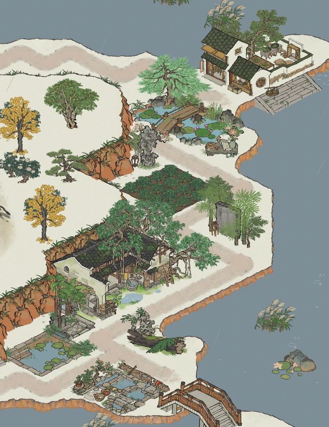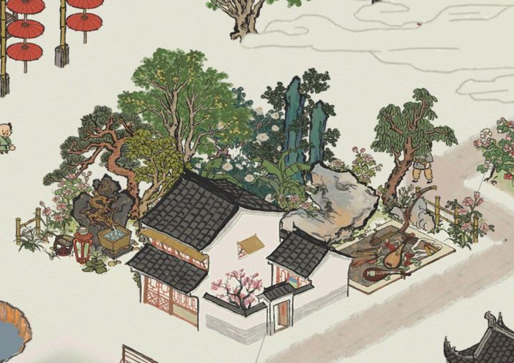 杭州民宅布局:街边演出,后花园民宅,山茶树,桂花树,双子峰