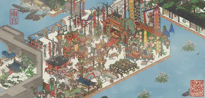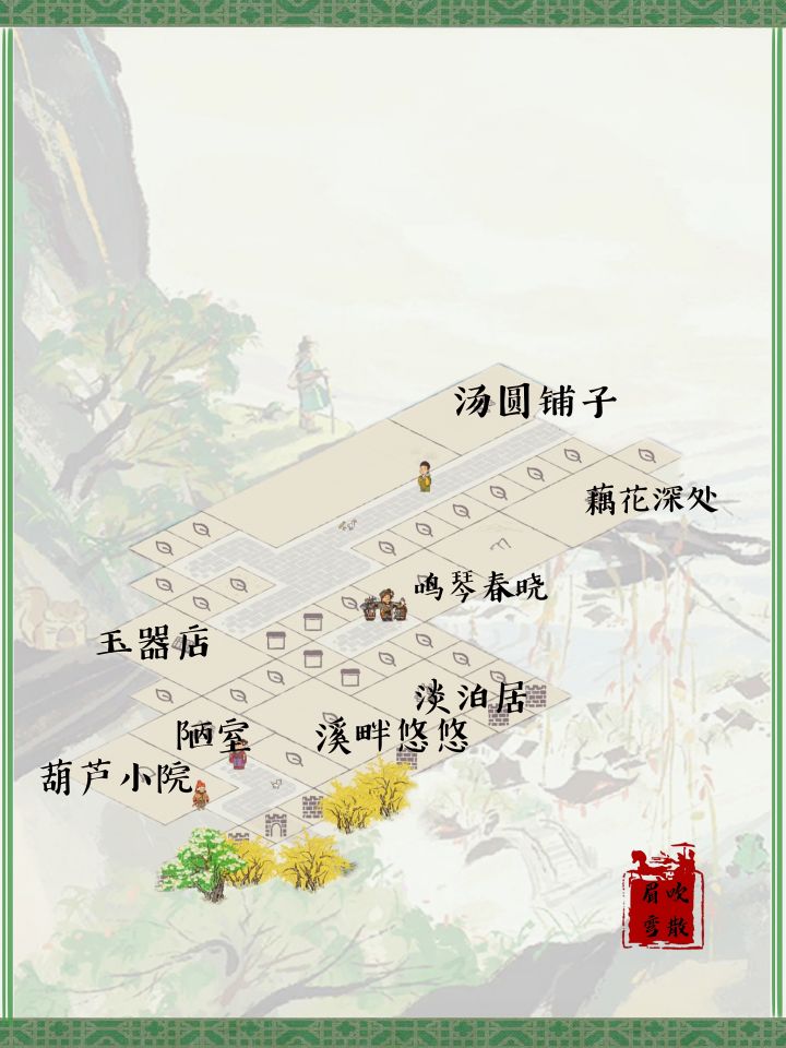 (1)咏絮里人们常在此处赏雪吟诗,以纪念谢道韫咏絮逸事。诗徒凌云住在山中归雪屋,好以诗会友,长桌品画,围炉煮酒,游园寻芳赏岁华。此间雪落梅花,看快雪时晴,迎春映雪,千树梨花开。(2)桃叶里第一幕:桃叶渡口,相思树下,月老祠前,女儿卜卦愿觅良缘。第二幕:云中雁两只,有情人一双,逛花灯街市,歌舞烟花,卧看牵牛织女星。第三幕:花轿迎亲,十里红妆,往来高朋,合两姓之好。