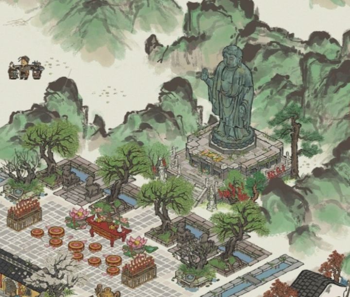 溪山佛像布局——玉佛道场佛像夹在徽州青山之中,前方左右放置过坎有鱼,中间放置莲花桌,莲花台,灯烛台和蒲团,旁边两个八卦炉镇场,广场用水渠围起来,前面放置地坑院,营造地窟之感