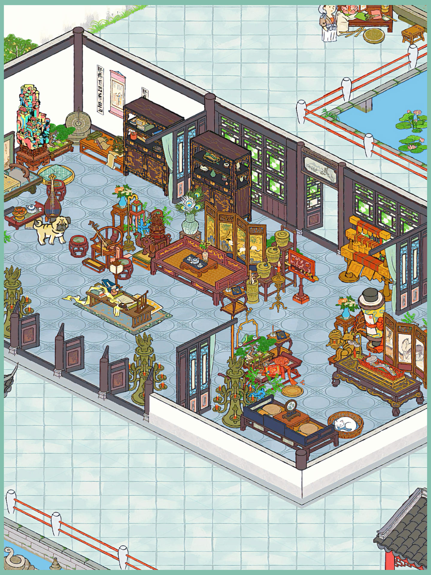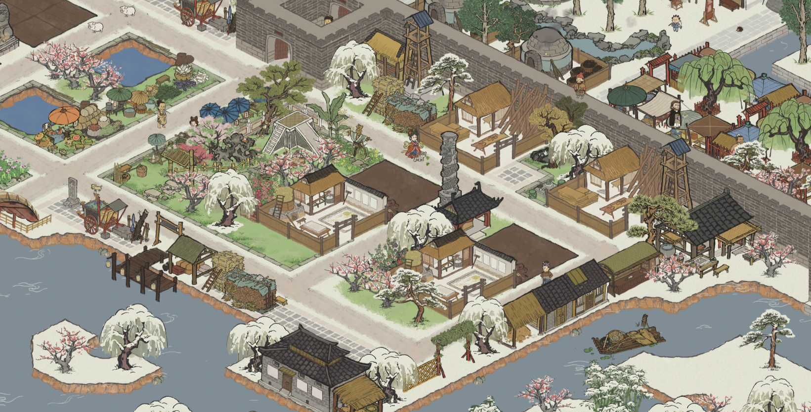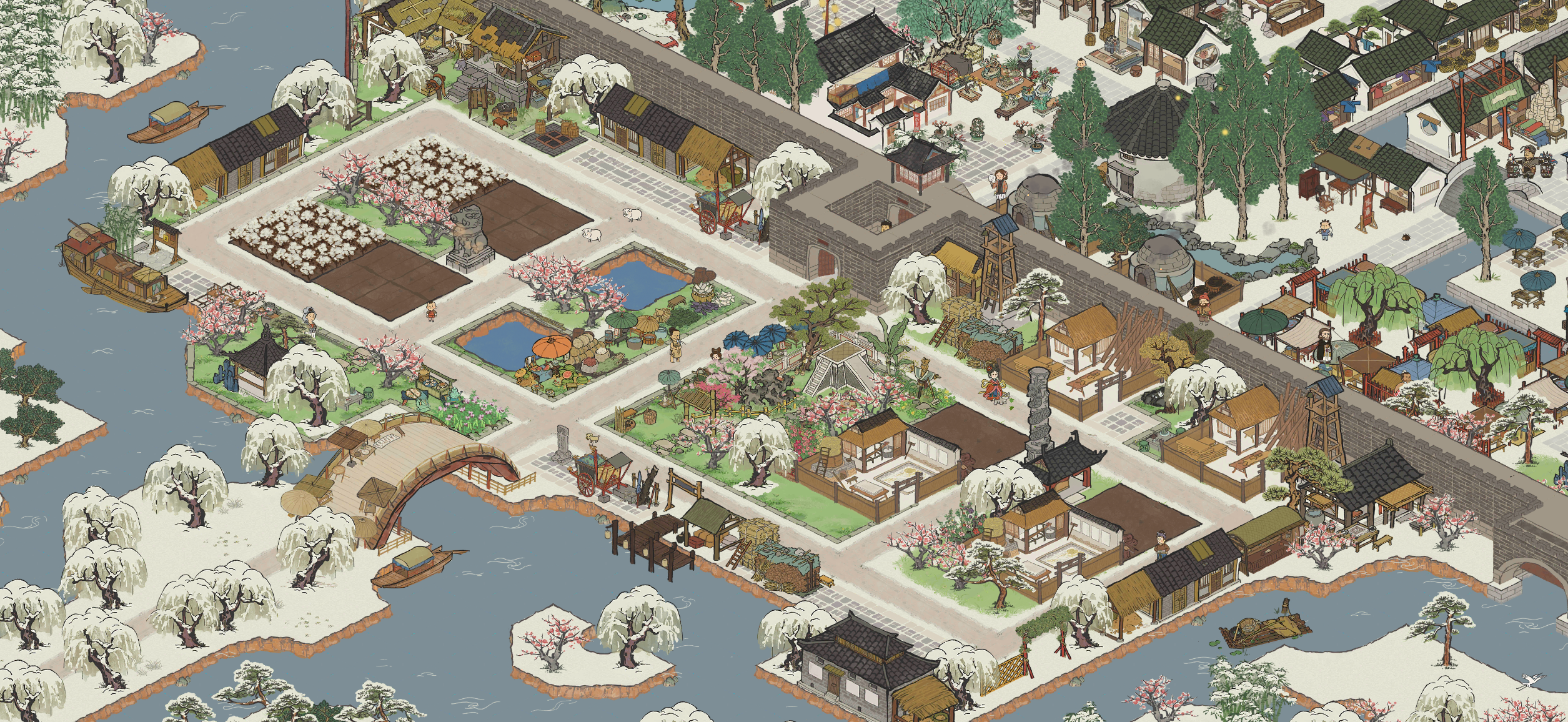 建筑:喜雨禾田、放鸢台、古柳迎春、仲夏悠居、清风亭、桃花水渠、春日踏青、义庄、语莺花市、临溪亭、璧泉垂秀、石桥花荫、月老祠、驿站、盆景园、风雅琴院、聚流亭、颜如玉、游凤画舫、水上戏台、甜品铺子生产建筑:铜矿、铜镜厂、养鸭场、餐馆、琥珀酒坊、锦绣饰坊、珍馐食肆、棉花田坐标:绍兴府·离索桥|春秋桥|运塘桥|同舟桥|渡人桥|惊鸿桥|倚斜桥|浣纱桥·全激活#