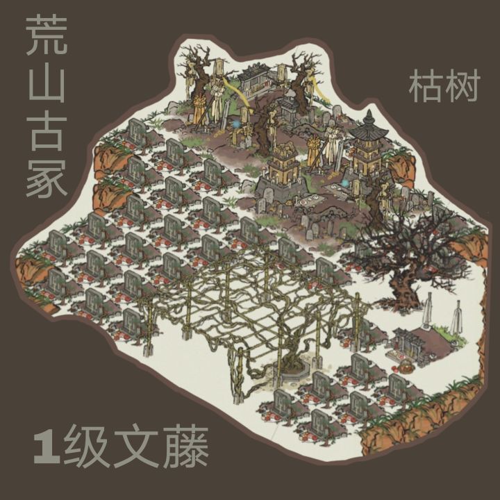 荒山古冢布局 / 杭州山顶荒山古冢 ×2 1级文藤 ×1 枯焦荒木 ×1 坟 ×n莫名觉得这些很搭本来想把那些一级的活动建筑都摆进来 但是太挡坟了就没选 还挺满意的 很萧瑟