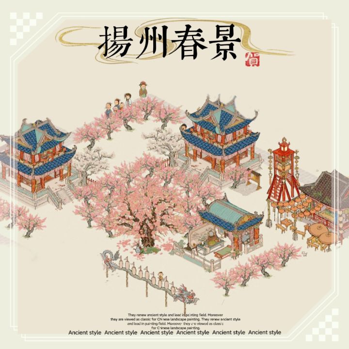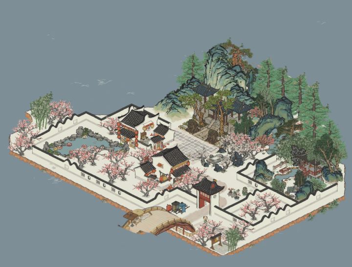 闻音阁+妆镜台+巨型桃花树。用海棠围绕桃花树冠可以增大一圈~