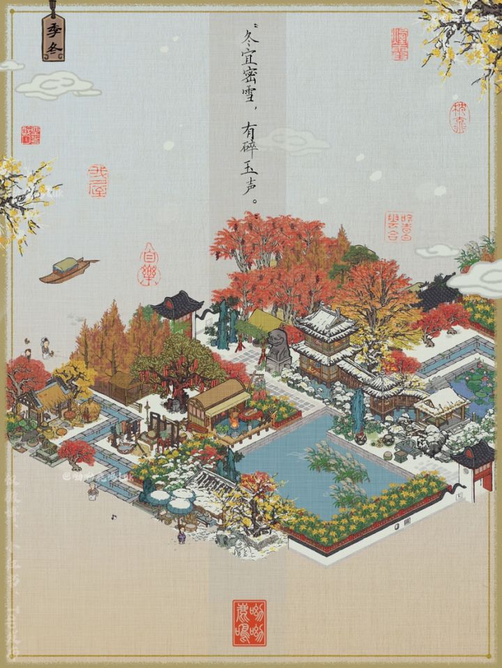 🌨“绿蚁新醅酒,红泥小火炉。”于炉膛木柴哔剥的时节,赏一场新雪。_P1-P4位于苏州府(杏枝坞、沉香坞、紫藤坞)P5-P7位于应天府-古刹布局算是其中最爱的一张了,感觉跟新出的山下塔门也是适合搭配在一起的。