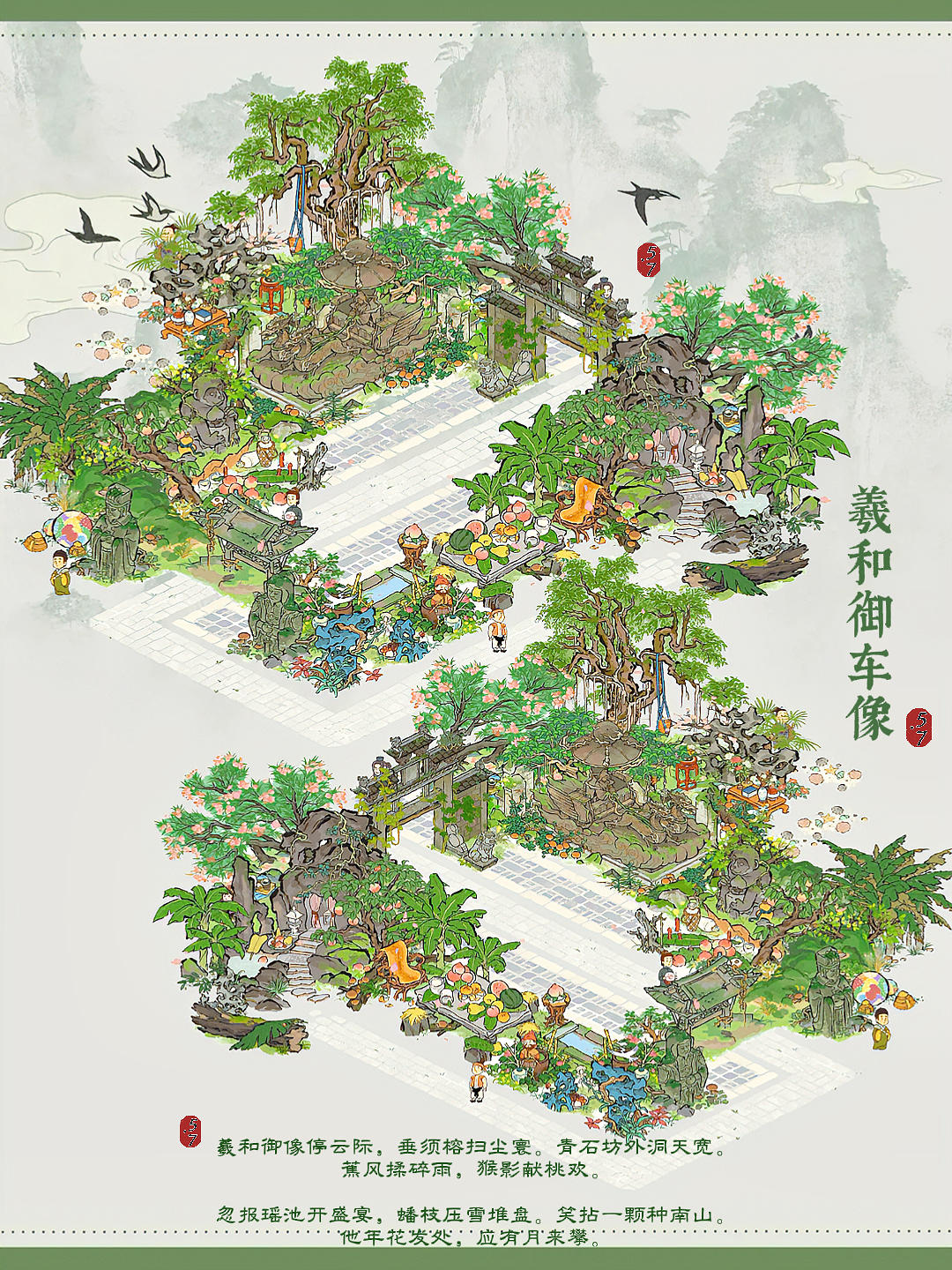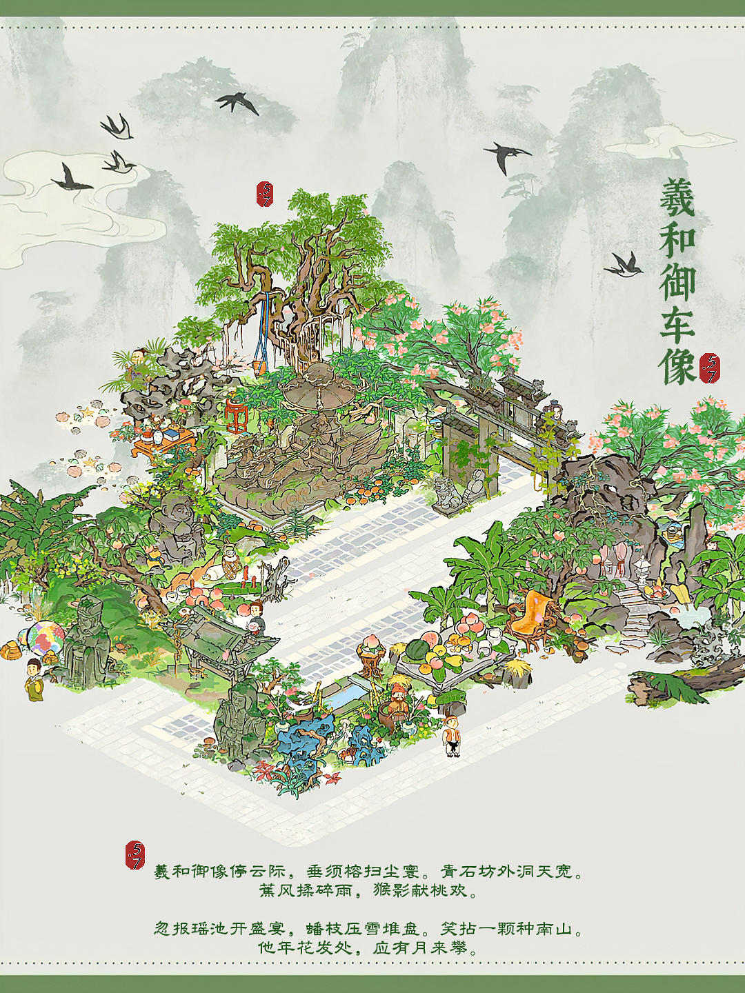 建筑:羲和御车像、绿园奇石、垂须榕树、竹桃残碑、青石坊、猴王献桃、蟠桃盛宴、芭蕉洞、旧苔门、#江南百景图 #江南百景图布局