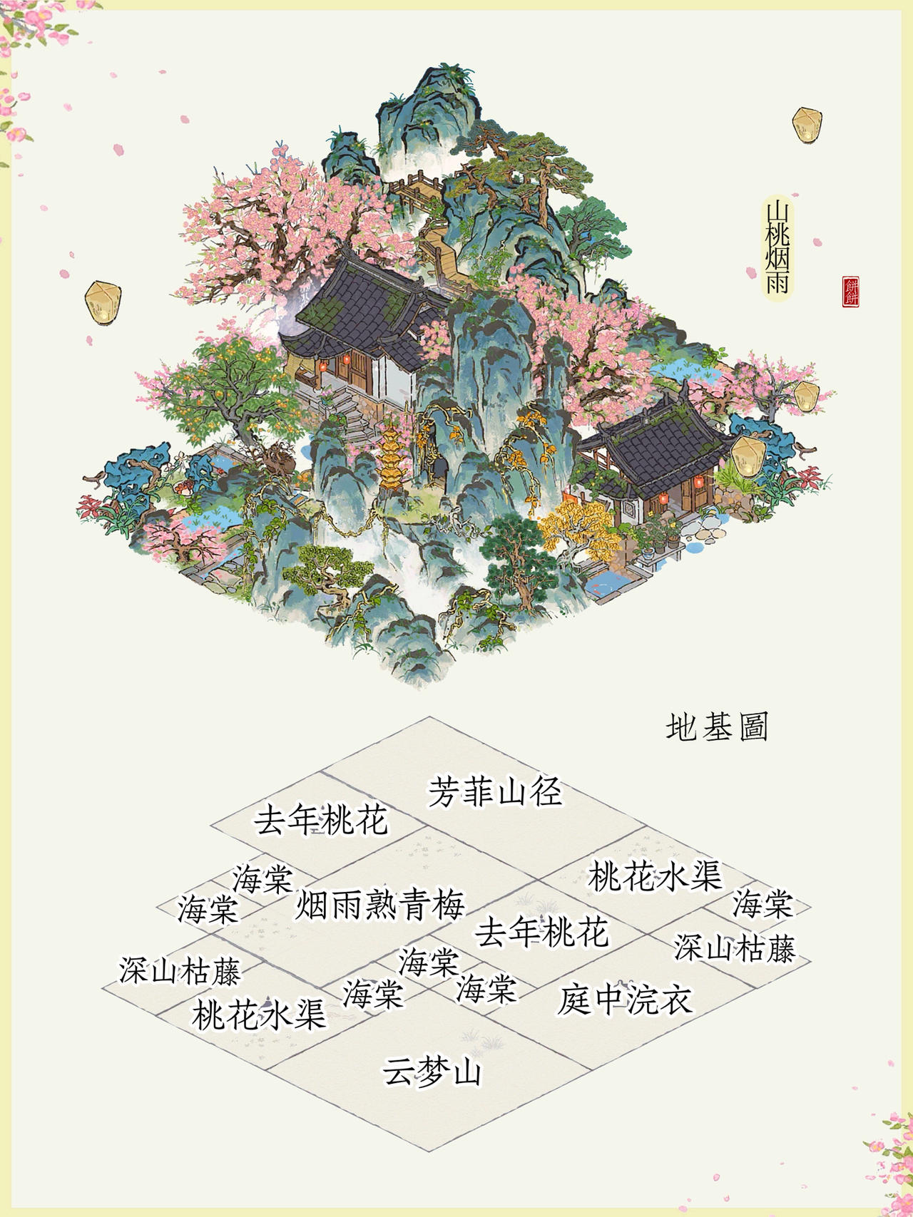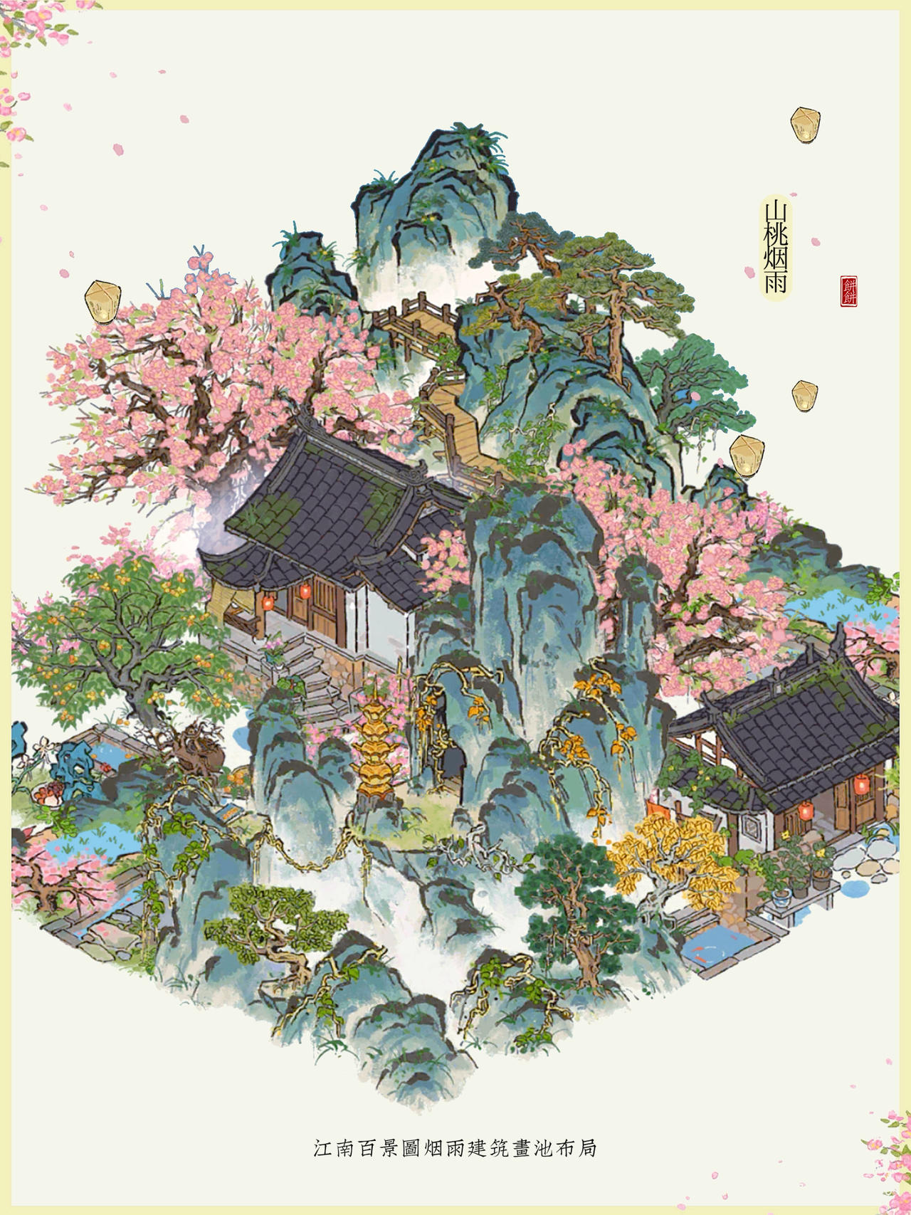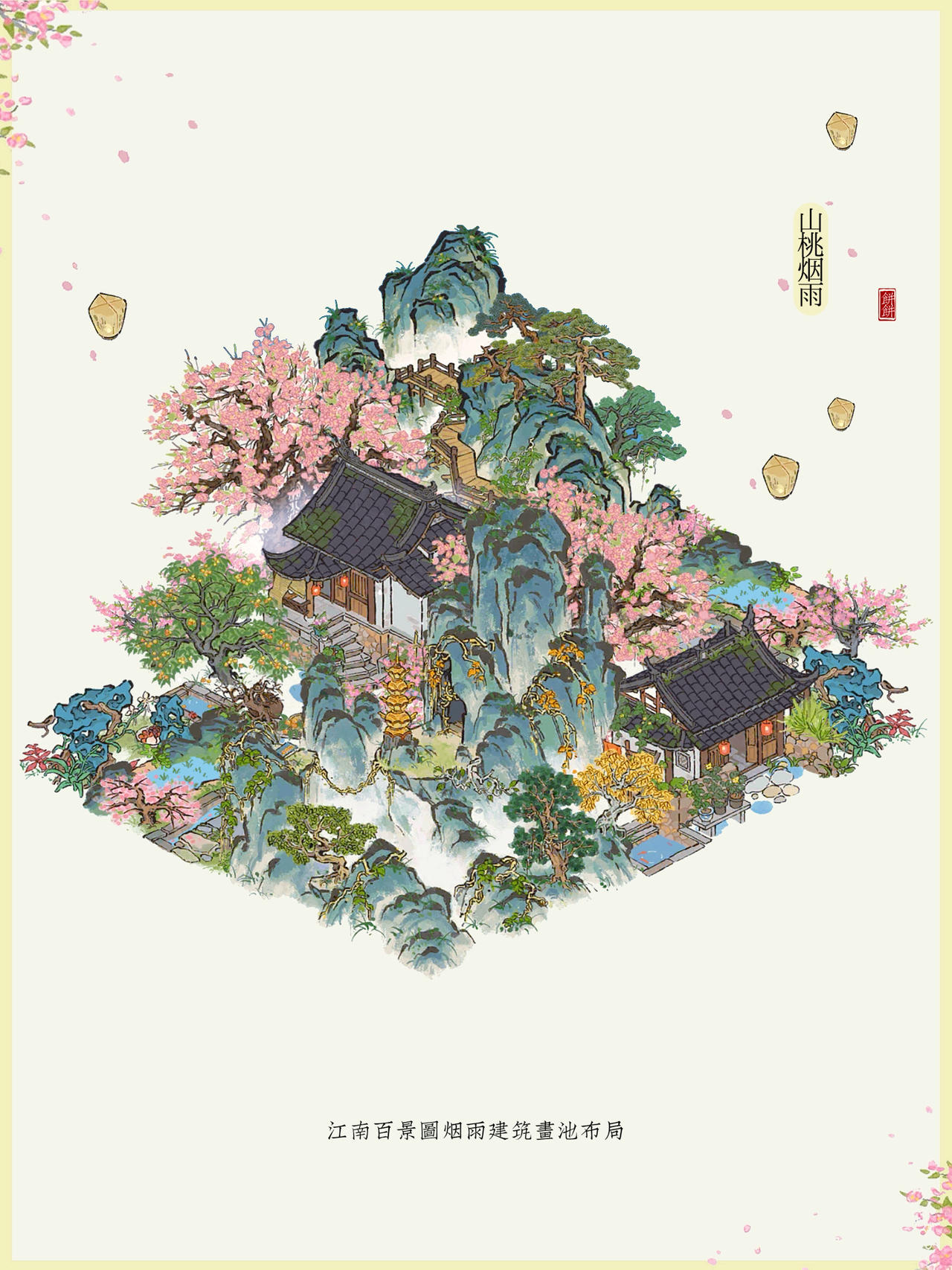🌸江南百景图|山桃烟雨🍃江南百景图烟雨建筑画池布局📍主要建筑:烟雨熟青梅、庭中浣衣、云梦山、芳菲山径、去年桃花、桃花水渠#今天游戏圈发生了啥#噗噜噜实验室#游戏种草计划#游戏安利#游戏推荐