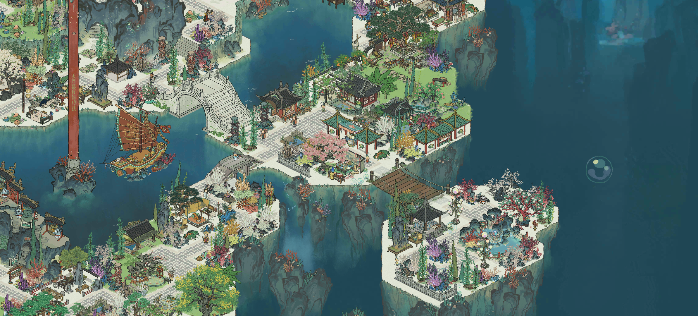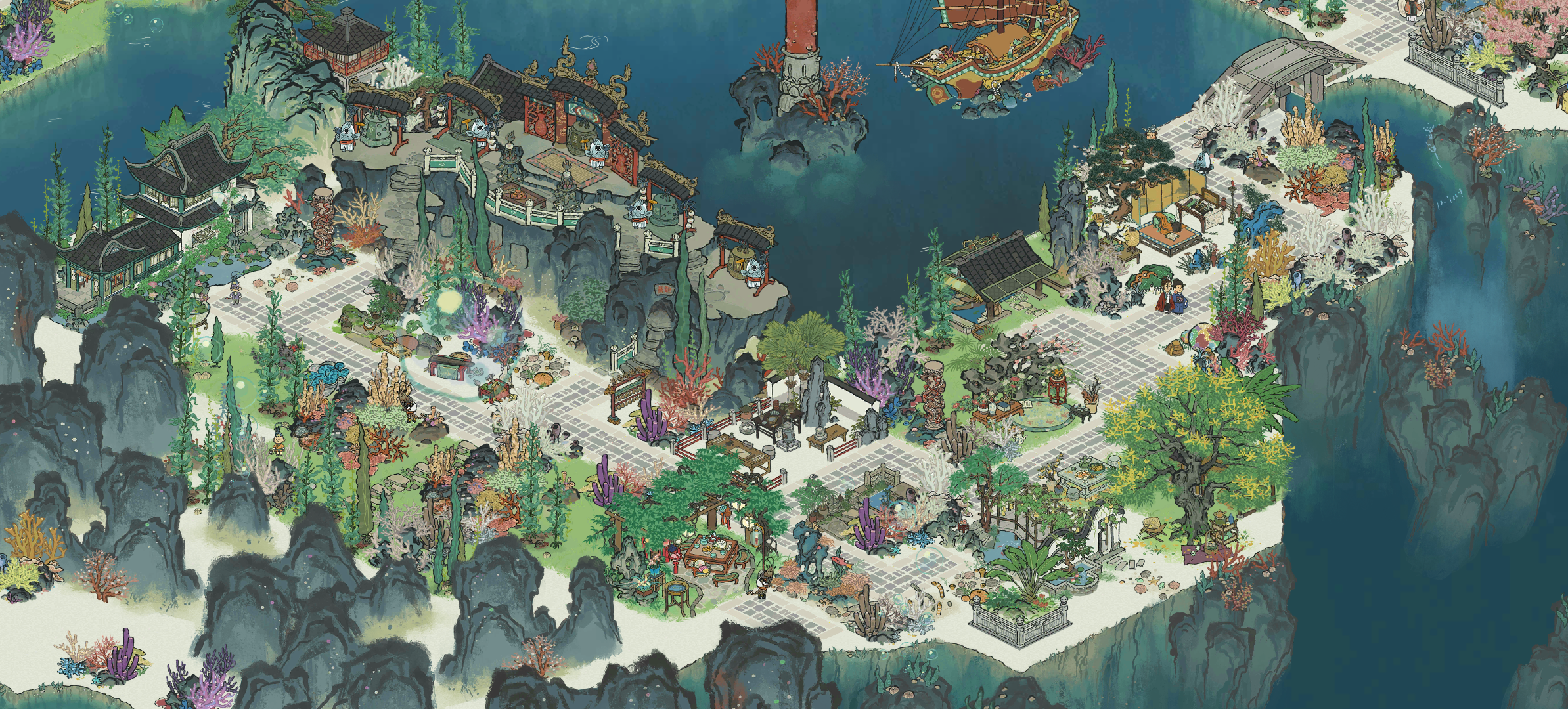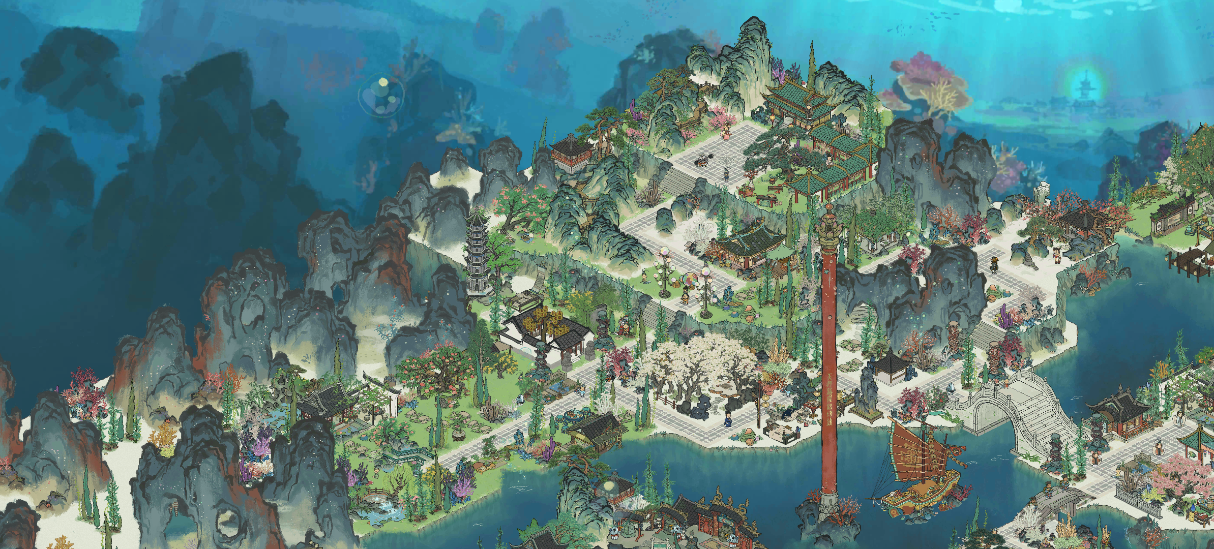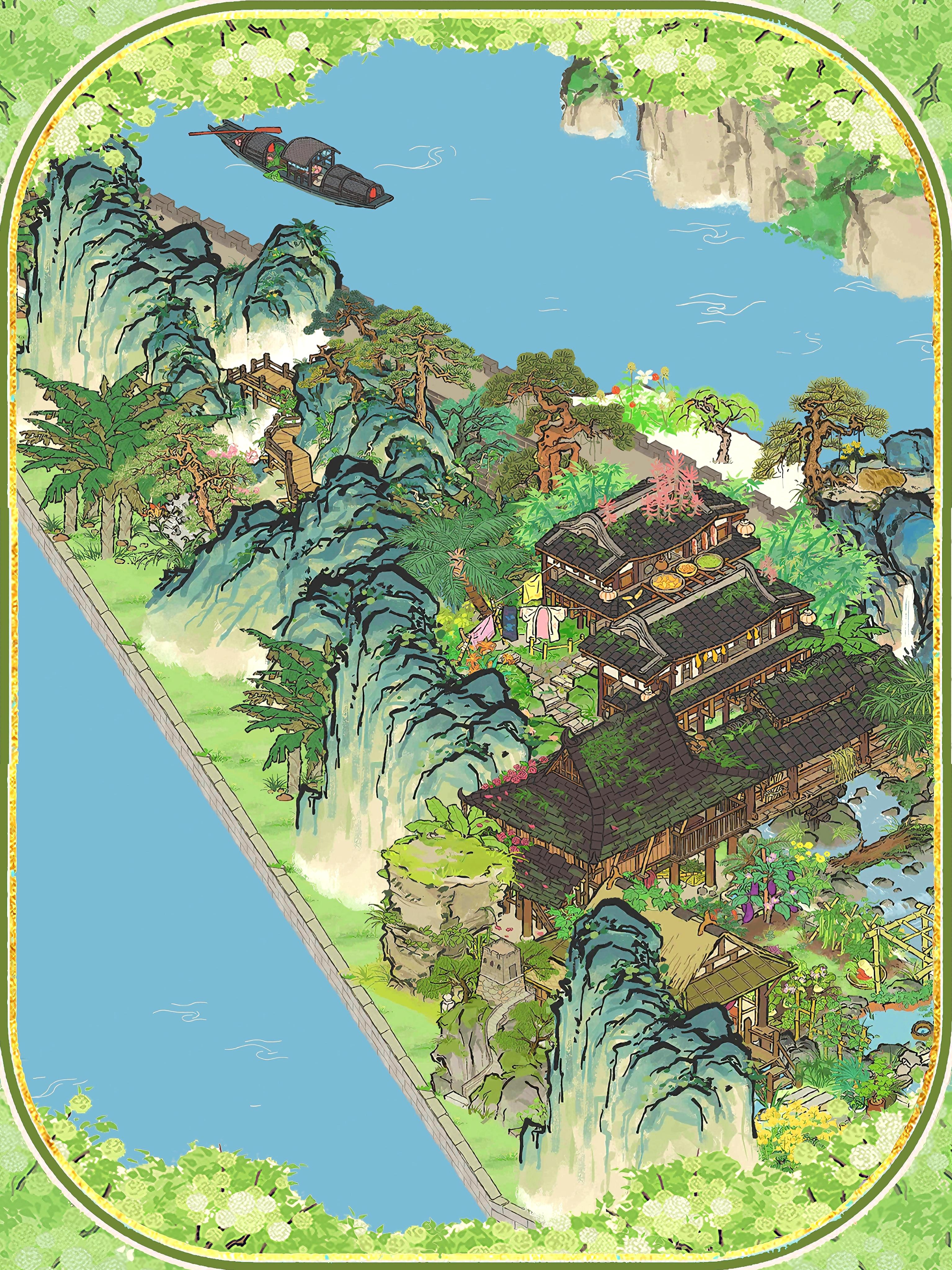 首先,依旧展示小镇全图样貌小镇分为三个板块,第一是棕岛旅游胜地,还原一种自然的岛屿风情,聚集的棕榈屋,山顶的泖塔,悬丝戏台,还有冰饮店。岛中心分为三个板块:第一部分是商业小摊贩,这里是岛民每日的贸易之地,热闹非凡。第二部分是城隍庙前,小岛也有一个泖塔,与图二的山顶高地的泖塔相衬映。第三部分是避暑小景,供知府居住。第三部分,更加具有原始风情的岛屿风情,黑瓦青苔,静谧安然,山顶的葫芦果,