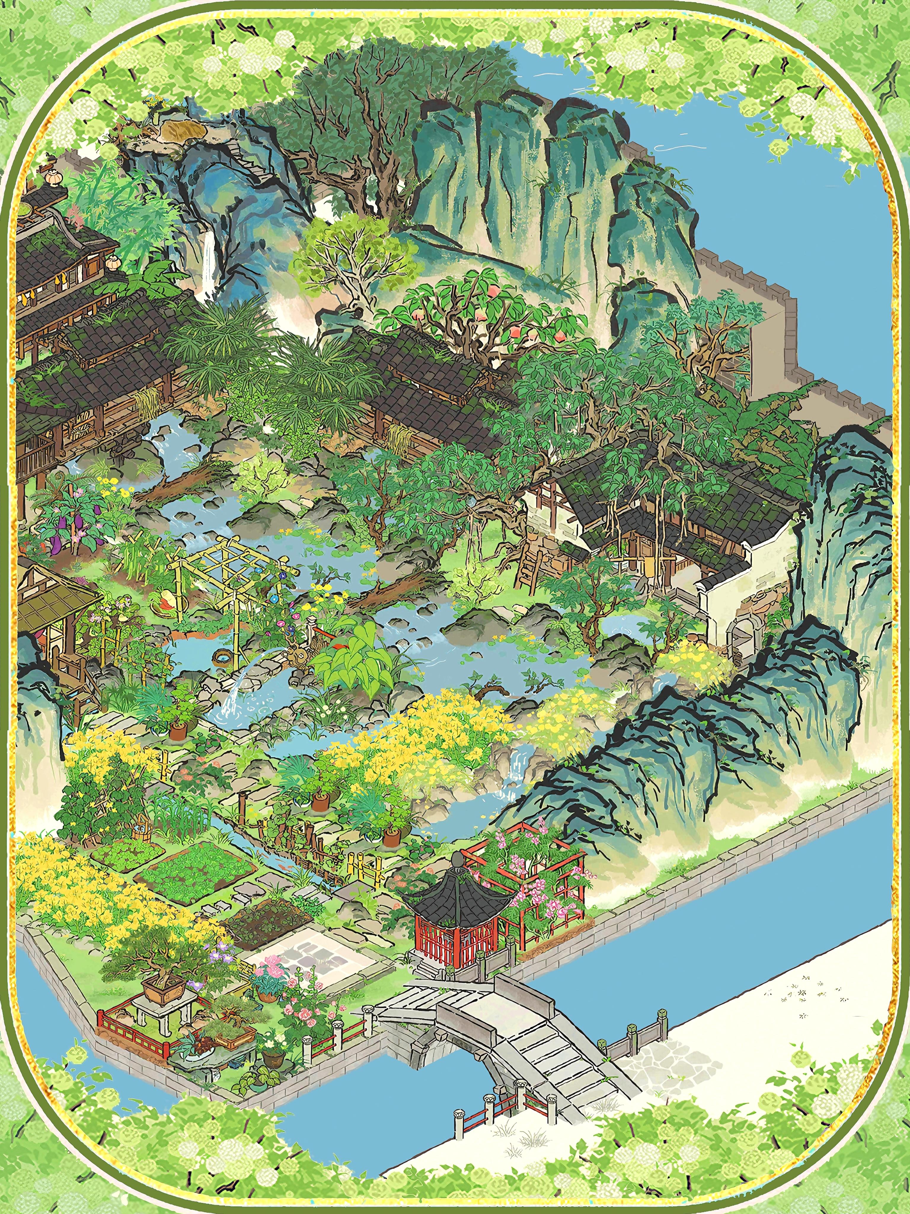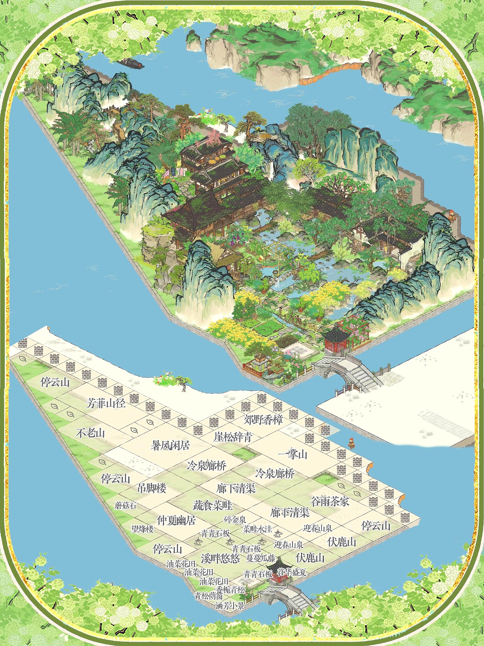 建筑:烟雨熟青梅、鸭池野趣、石桥花荫、熟食菜畦、春园小径、亭亭枇杷、竹桃残碑、苍绿山坡、农家栅栏#江南百景图 #江南百景图布局