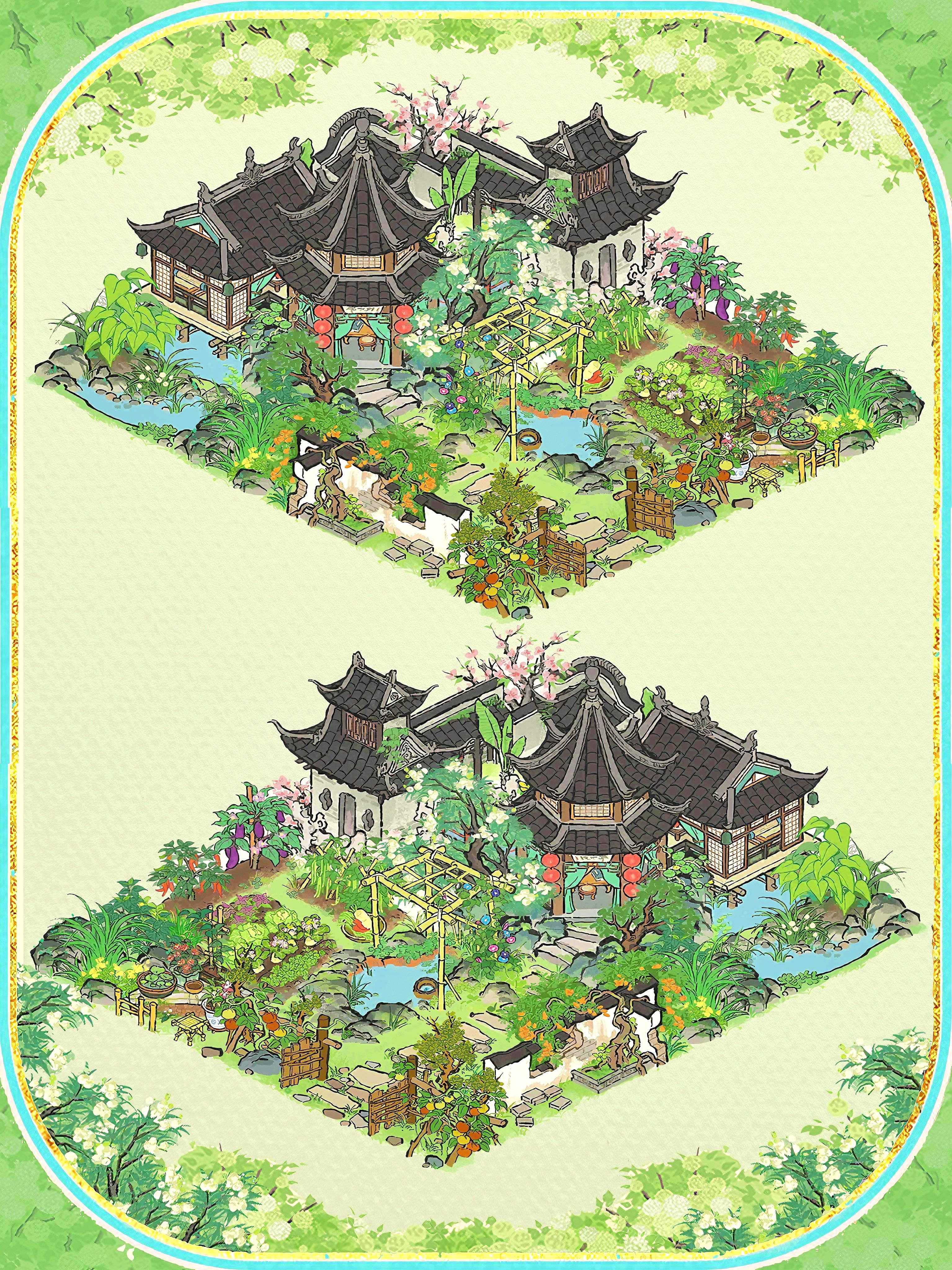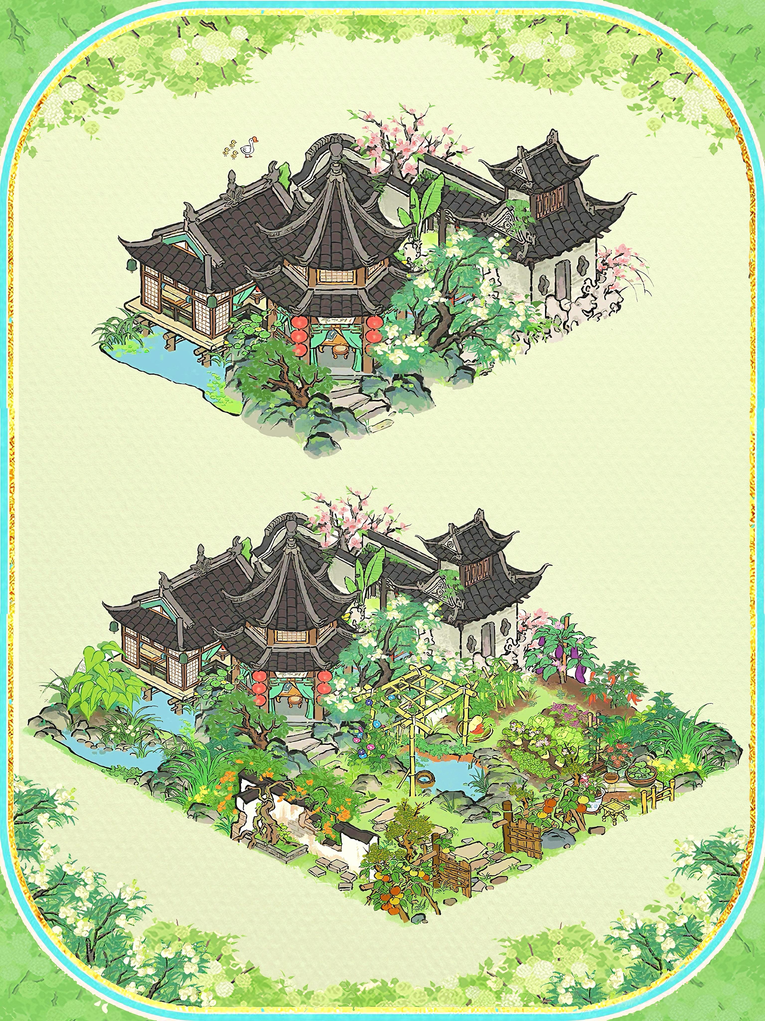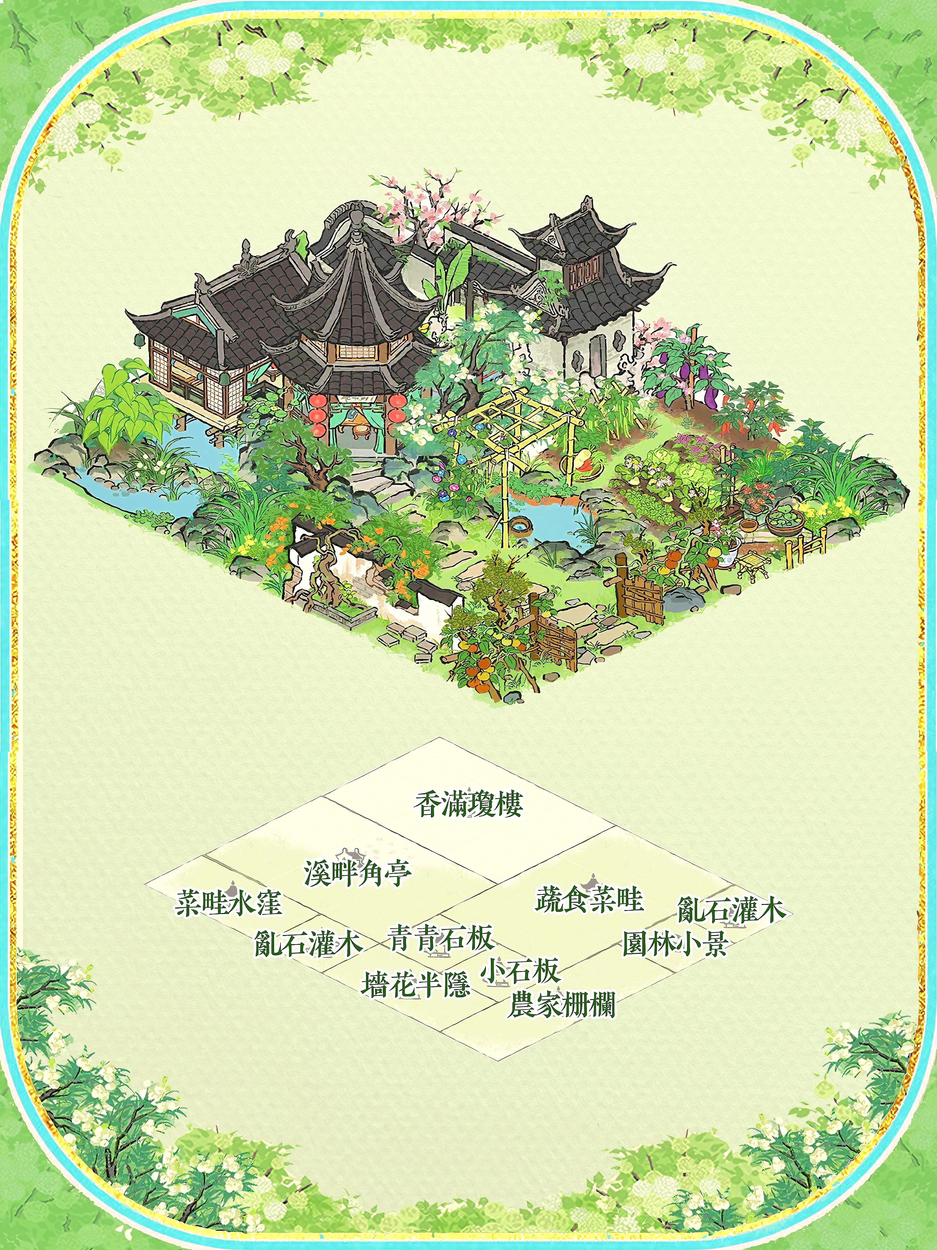 建筑:香满琼楼,溪畔角亭,蔬食菜畦,墙花半隐,园林小景,乱石灌木,菜畦水洼,农家栅栏#江南百景图 #今天游戏圈发生了啥 #游戏种草计划