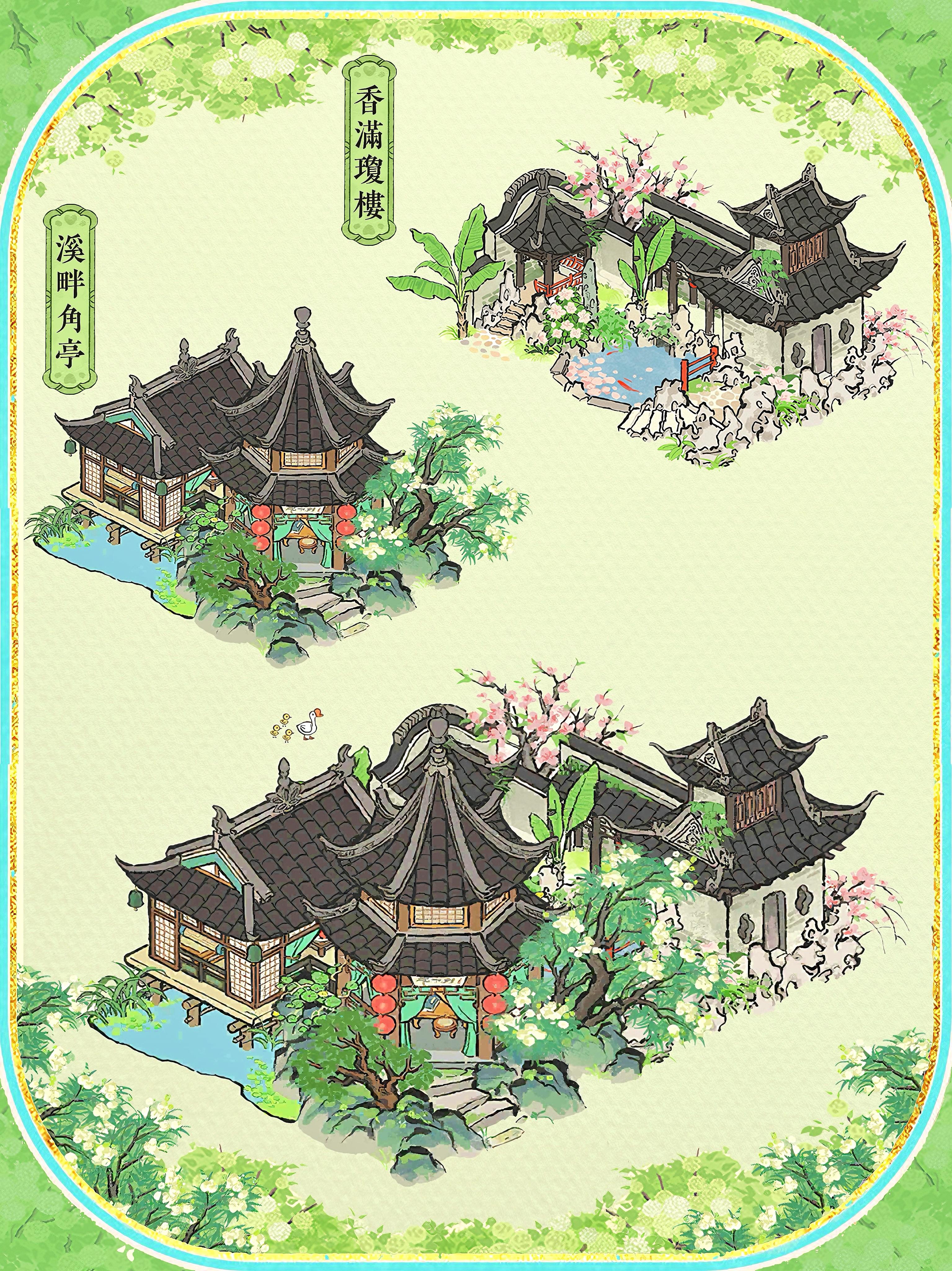 建筑:溪畔角亭,吉祥长廊,消暑闲居,落花墙外,对饮花下,树荫亭,转角石板,香栀青松,小石板,青青石板#江南百景图 #今天游戏圈发生了啥 #游戏种草计划