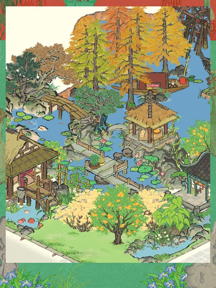 建筑:灵光庙,霜红小径,心乐亭,秋日静居,灵麒塔,金钱松,连香树,知秋落枫,糯米铺子,糖人摊,火树花灯墙,元夕花灯墙#江南百景图 #江南百景图布局 #发现好游戏