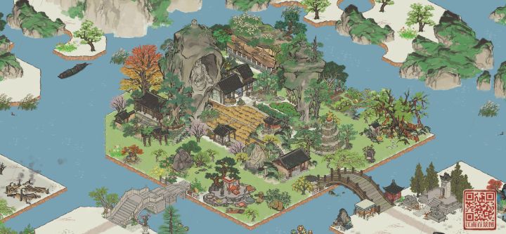 建筑:倚岩大佛,时思寺,一掌山,伏鹿山,停云山,鹤鸣山,不老山,疏疏蕉叶,蔓蔓瓜藤,青青石板,半亩油菜,乱石灌木#江南百景图 #江南百景图布局